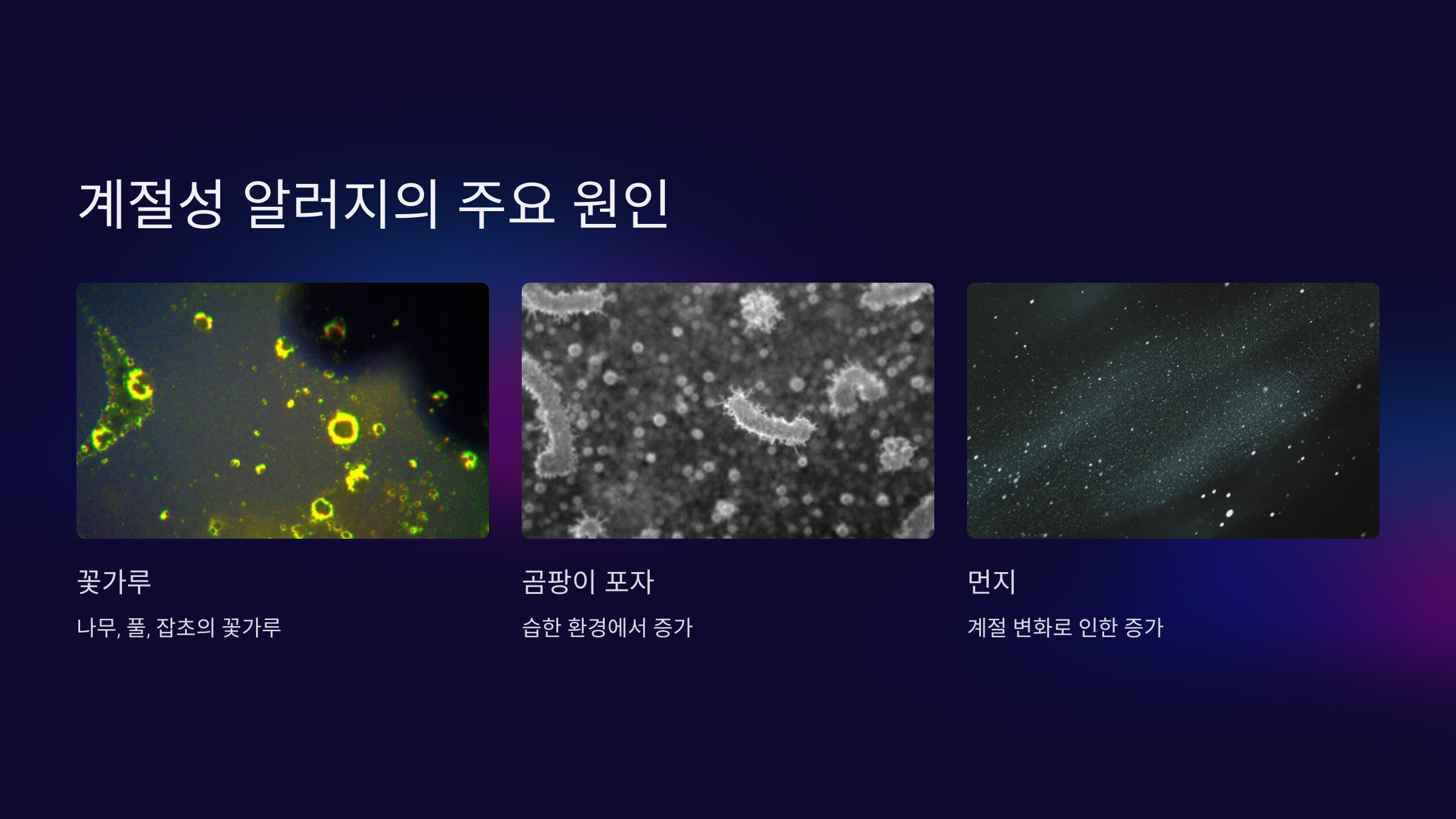 - 나무, 풀, 잡초에서 나오는 꽃가루가 공기 중에 떠다니며 알러지 반응을 유발합니다.