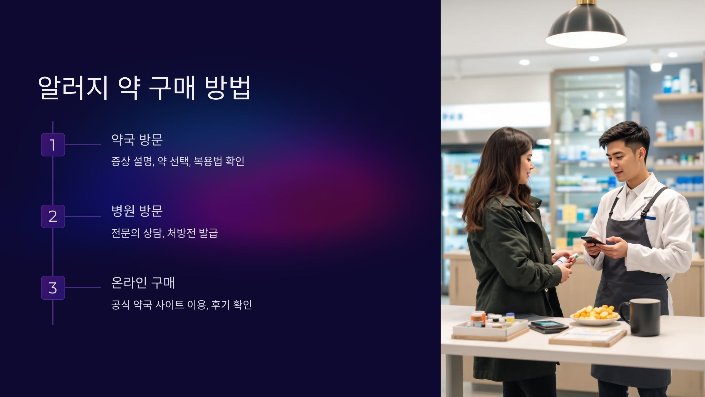 알러지 약은 병원 처방 또는 일반 약국에서 구입할 수 있으며, 일부 제품은 온라인으로도 구매 가능합니다.