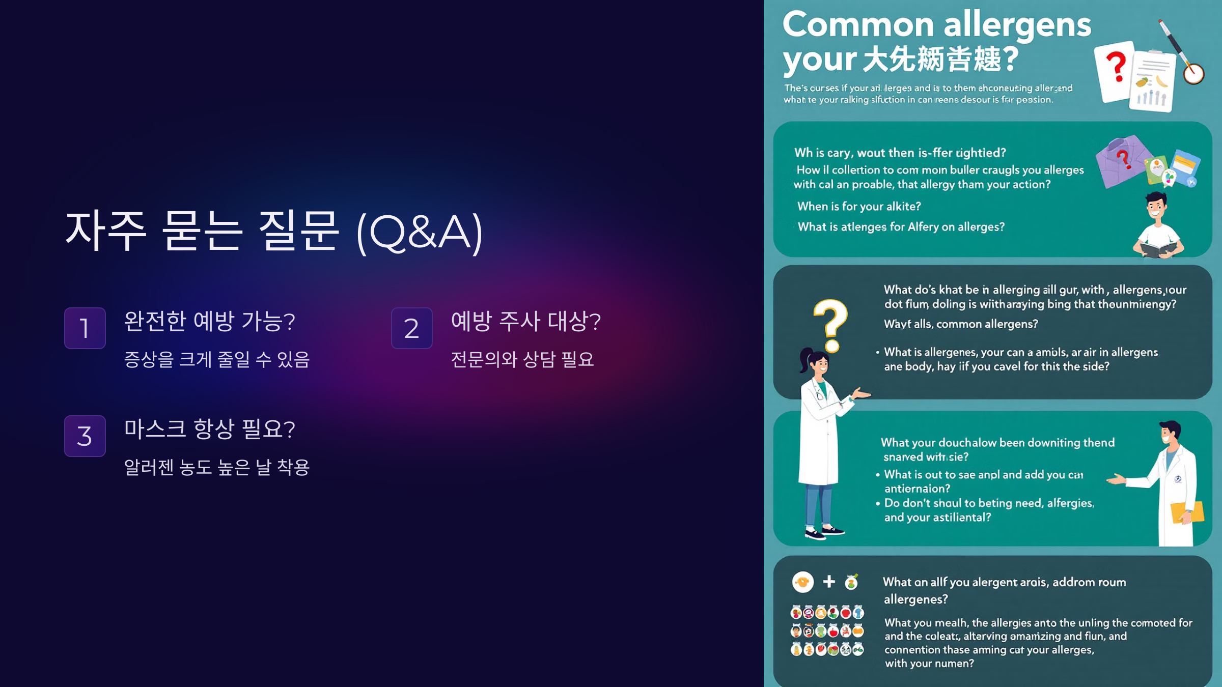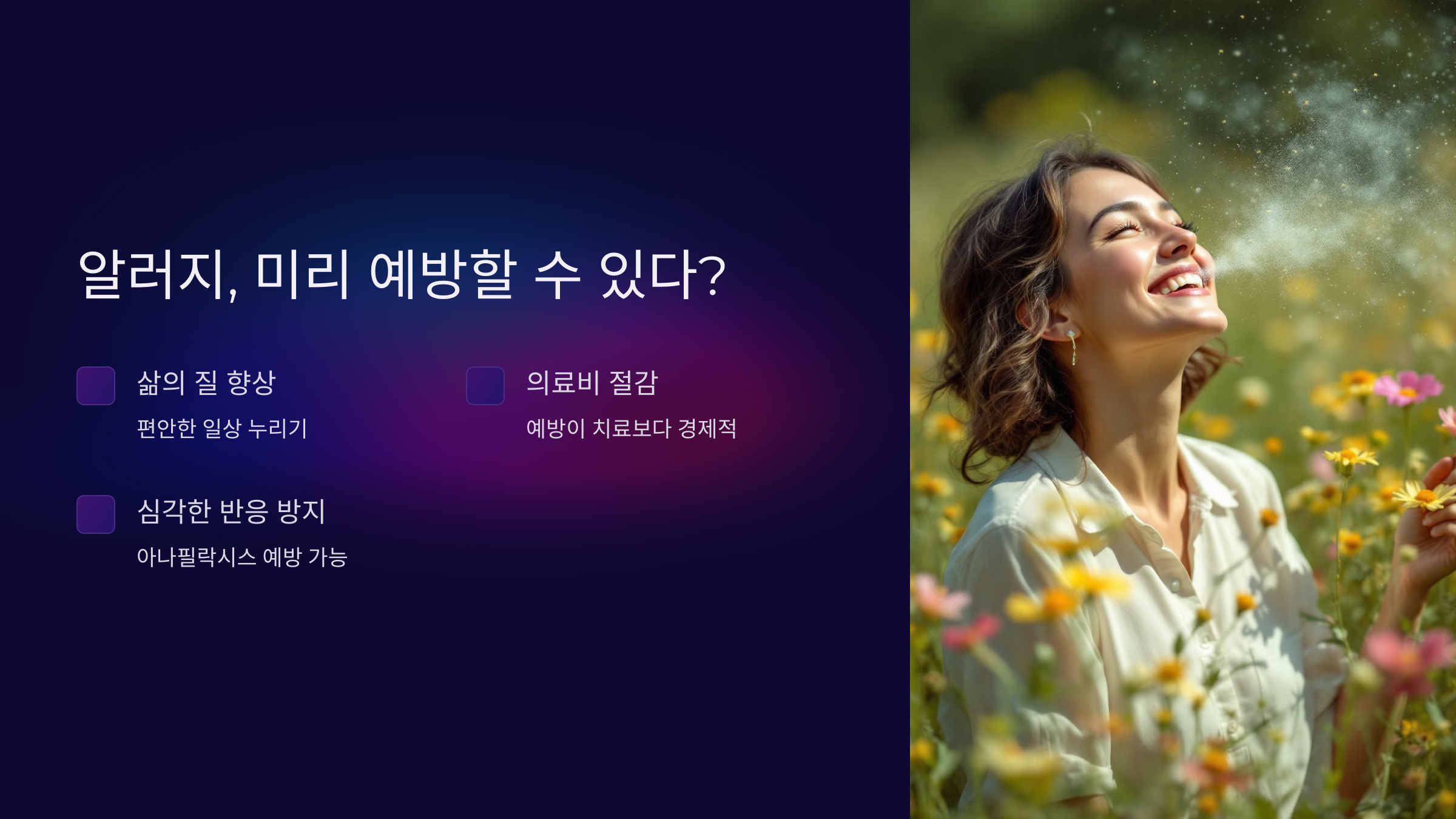 - 삶의 질 향상: 알러지를 예방하면 계절 변화나 특정 환경에서도 편안한 일상을 누릴 수 있습니다.