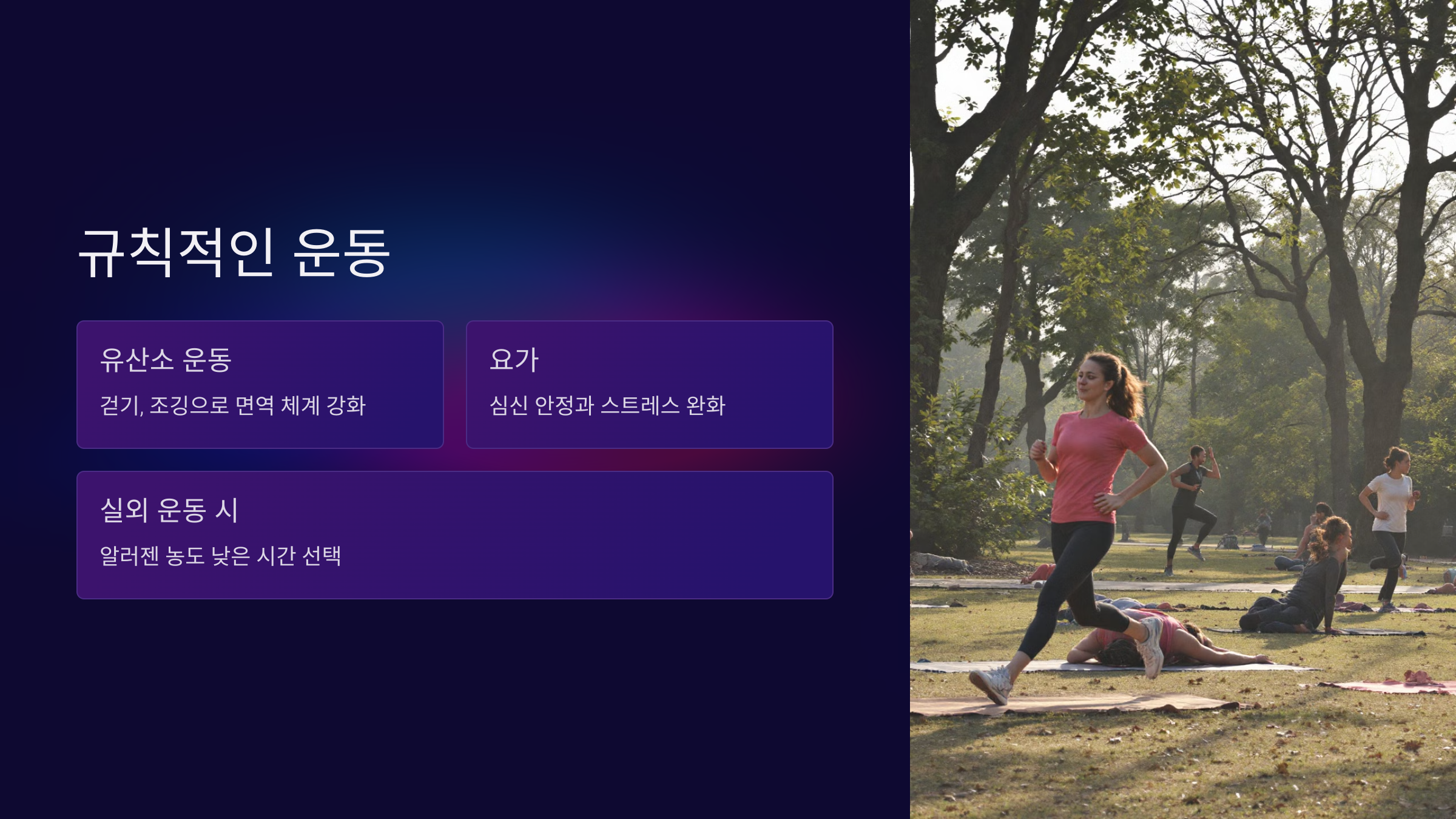 운동은 면역 체계를 강화하고 스트레스를 줄여 알러지를 예방하는 데 도움이 됩니다.