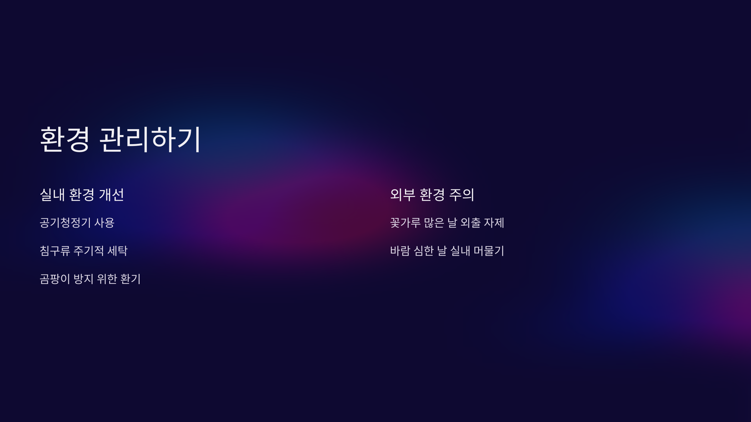 - 공기청정기 사용: 먼지와 꽃가루를 걸러내는 데 효과적입니다.