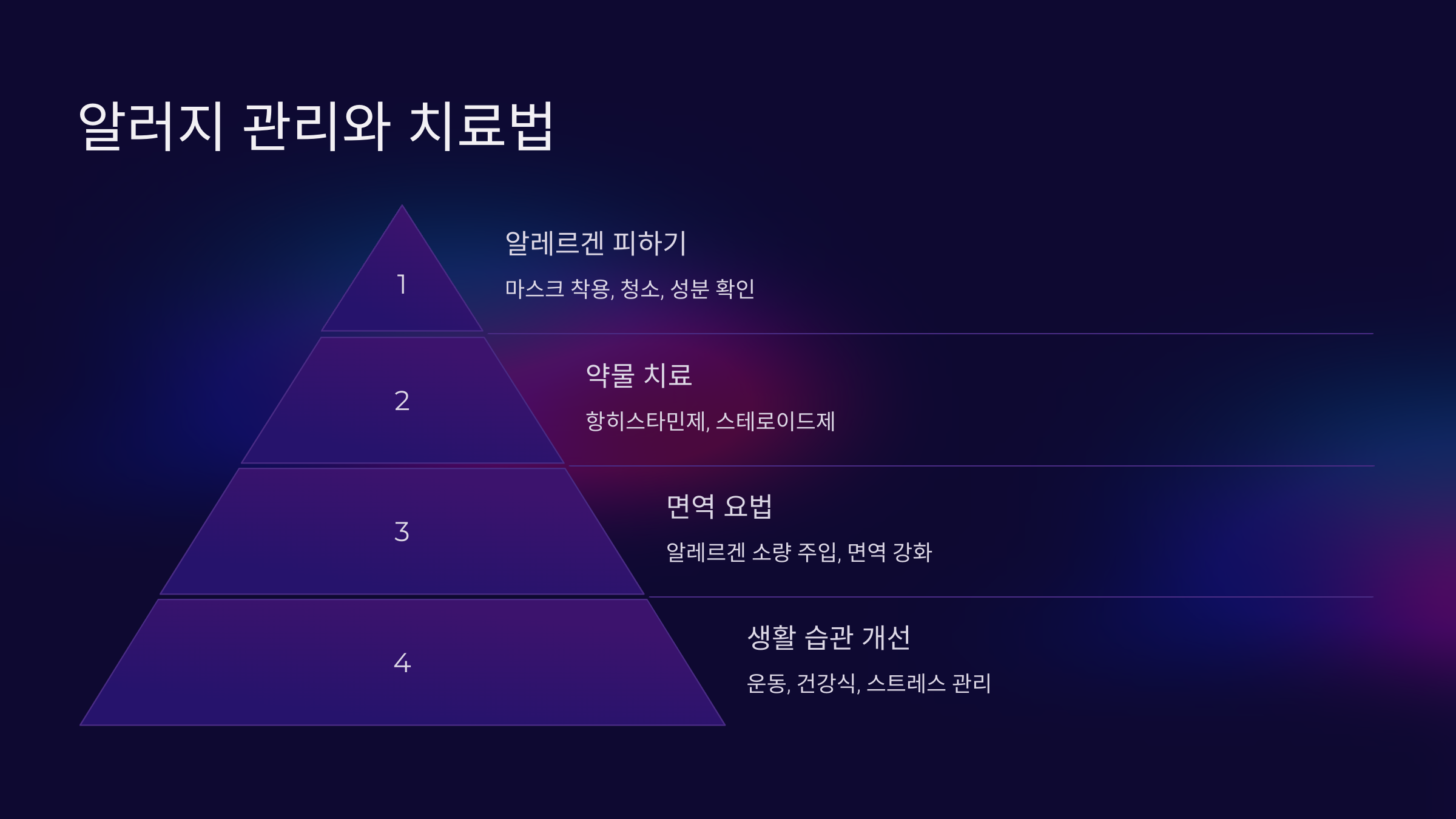 알러지는 완치보다는 증상 관리가 중요합니다. 다음은 알러지를 관리하는 데 유용한 방법들입니다.