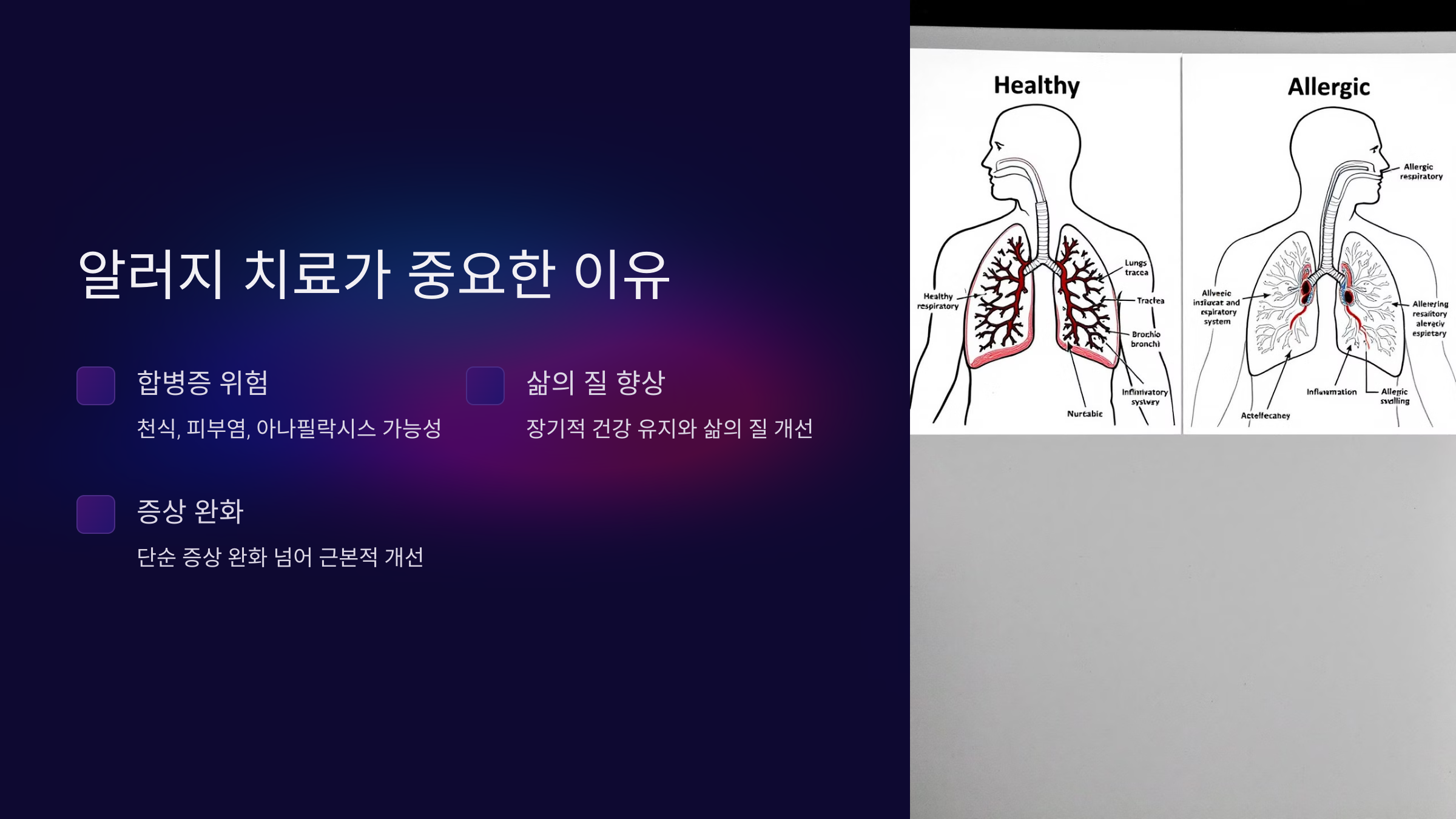 알러지는 단순히 재채기나 가려움증으로 끝나지 않을 수 있습니다. 방치할 경우 천식, 피부염, 심각한 아나필락시스 같은 합병증으로 이어질 수 있기 때문입니다.