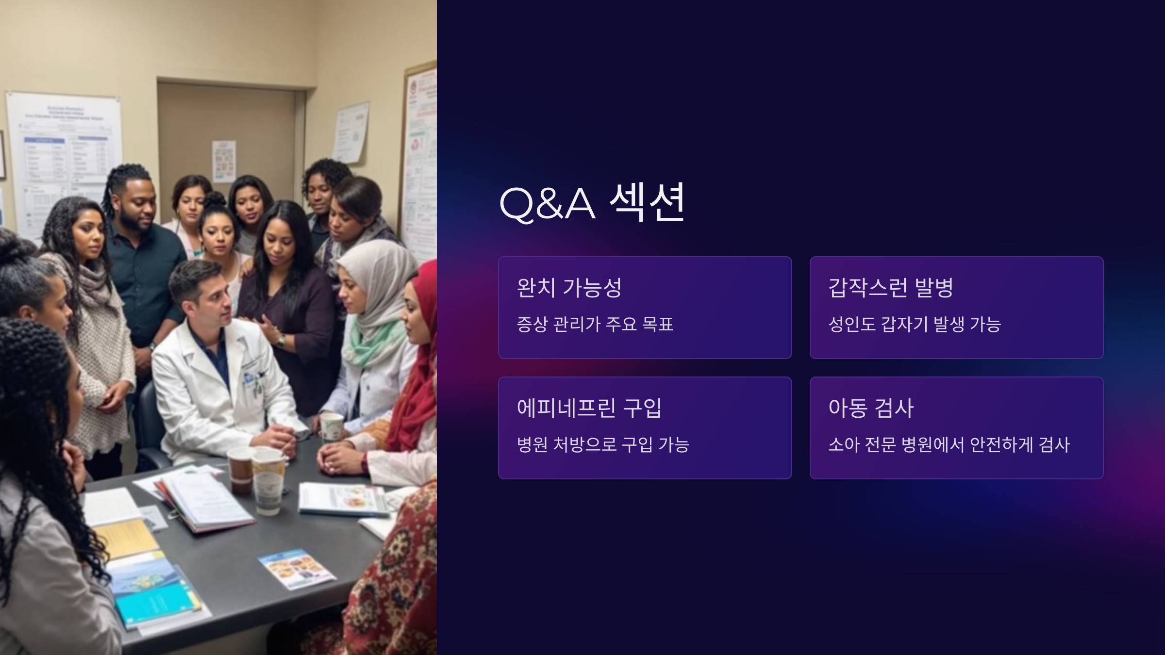 💡 팁: 알러지 반응이 심한 경우 항상 에피네프린 주사기를 휴대하세요.