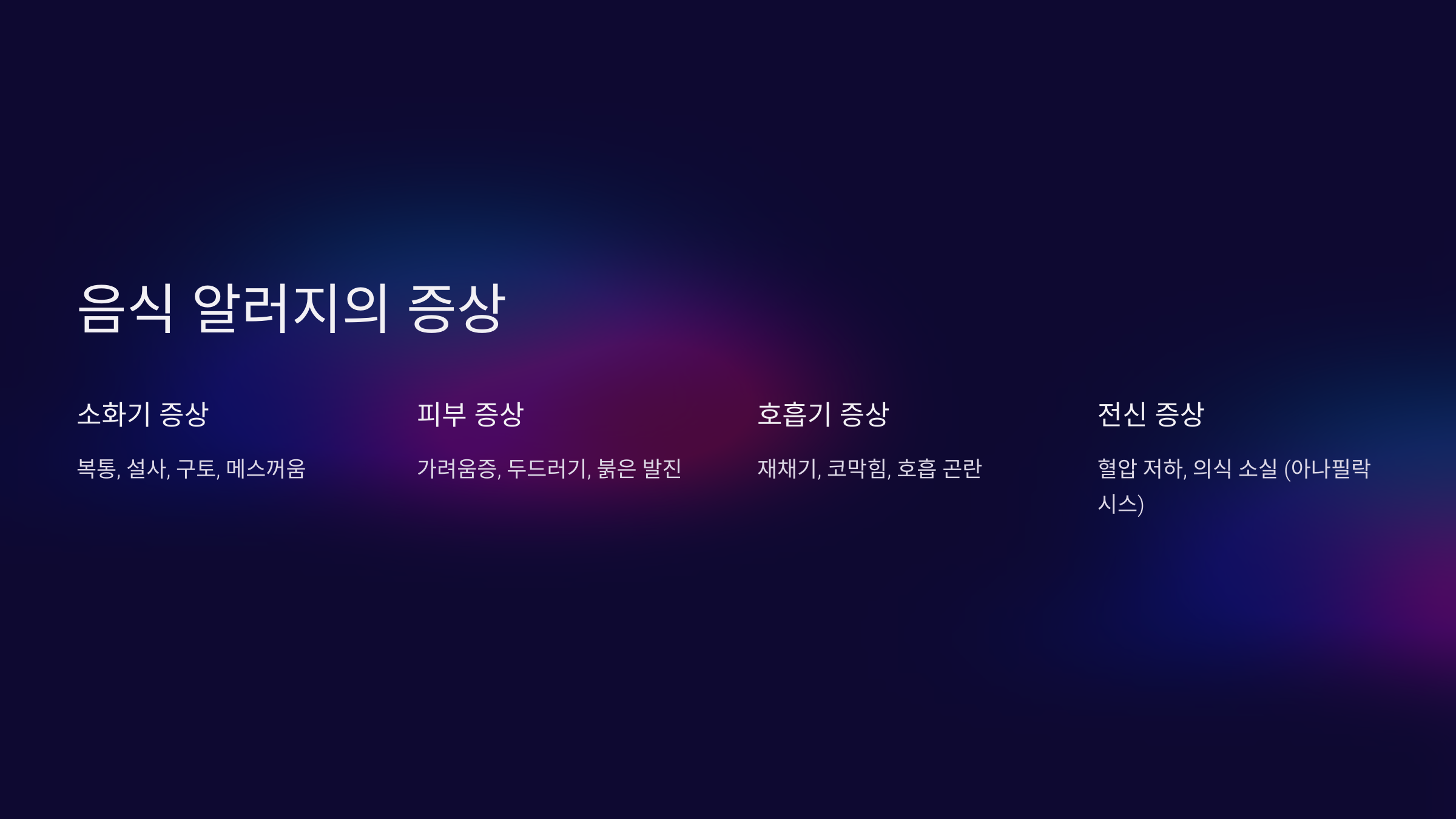 음식 알러지의 증상은 섭취한 음식과 사람의 체질에 따라 다양하게 나타납니다. 주요 증상은 다음과 같습니다.