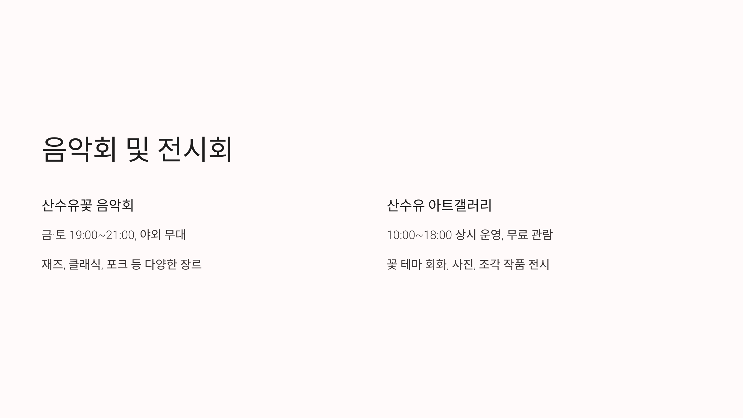 | 산수유꽃 음악회 | 금·토 19:00 ~ 21:00 | 야외 무대 | 자유 참여 |