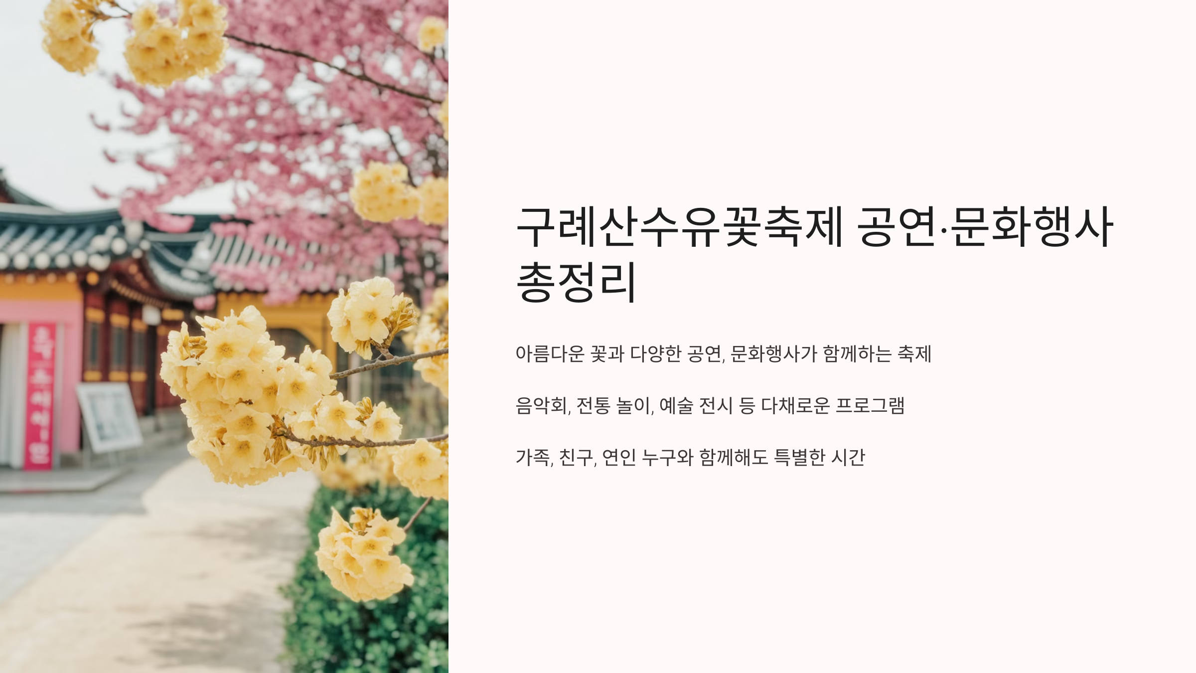 구례산수유꽃축제에서는 아름다운 꽃만큼이나 다양한 🎶공연과 문화행사🎨가 열려요. 현장에서는 음악회, 전통 놀이, 예술 전시 등 다채로운 프로그램이 진행돼요. 이번 글에서는 주요 공연과 문화 체험, 참여 방법까지 모두 알려드릴게요!