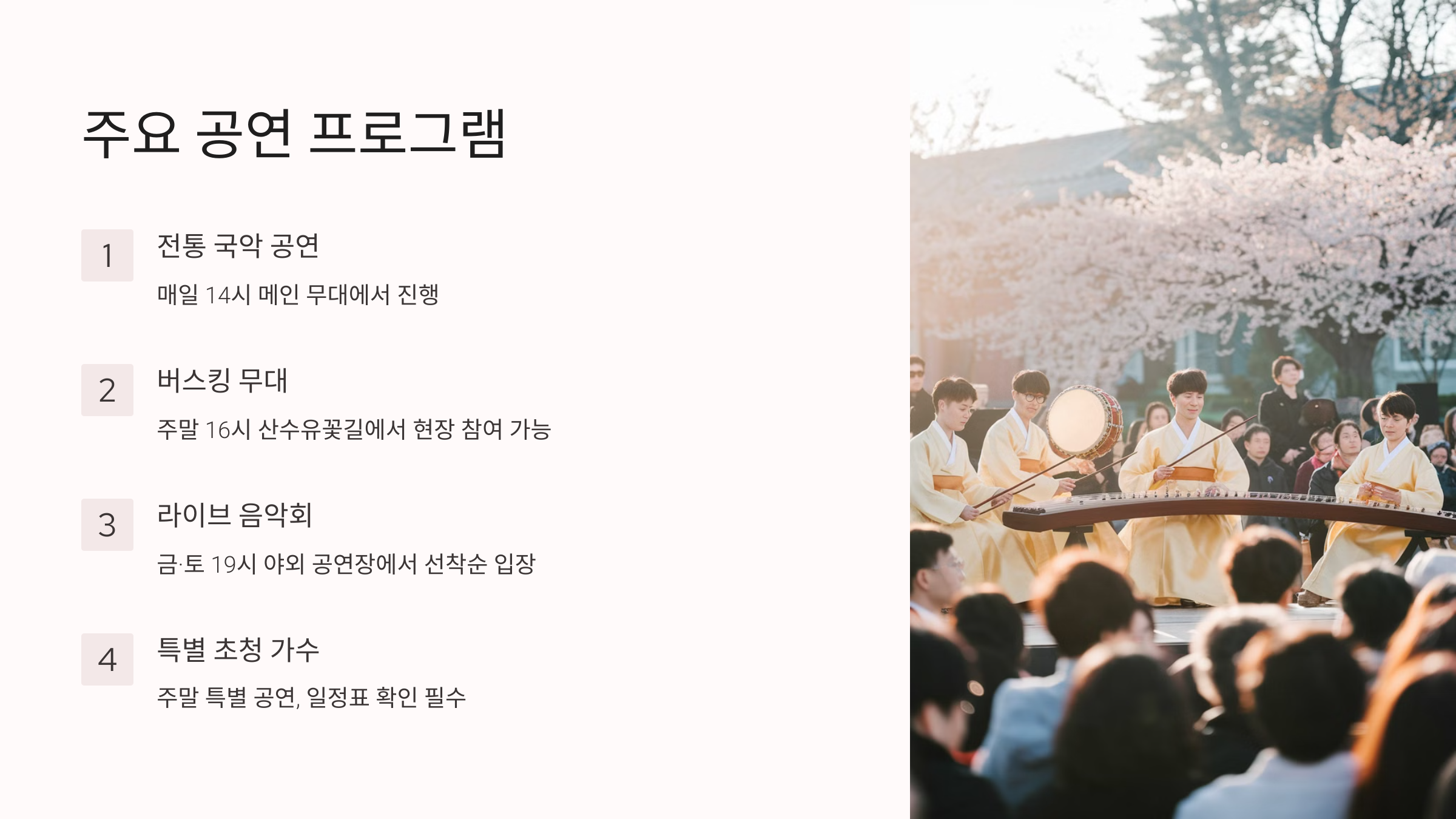 | 전통 국악 공연 | 14:00 ~ 15:00 | 메인 무대 | 자유 관람 |