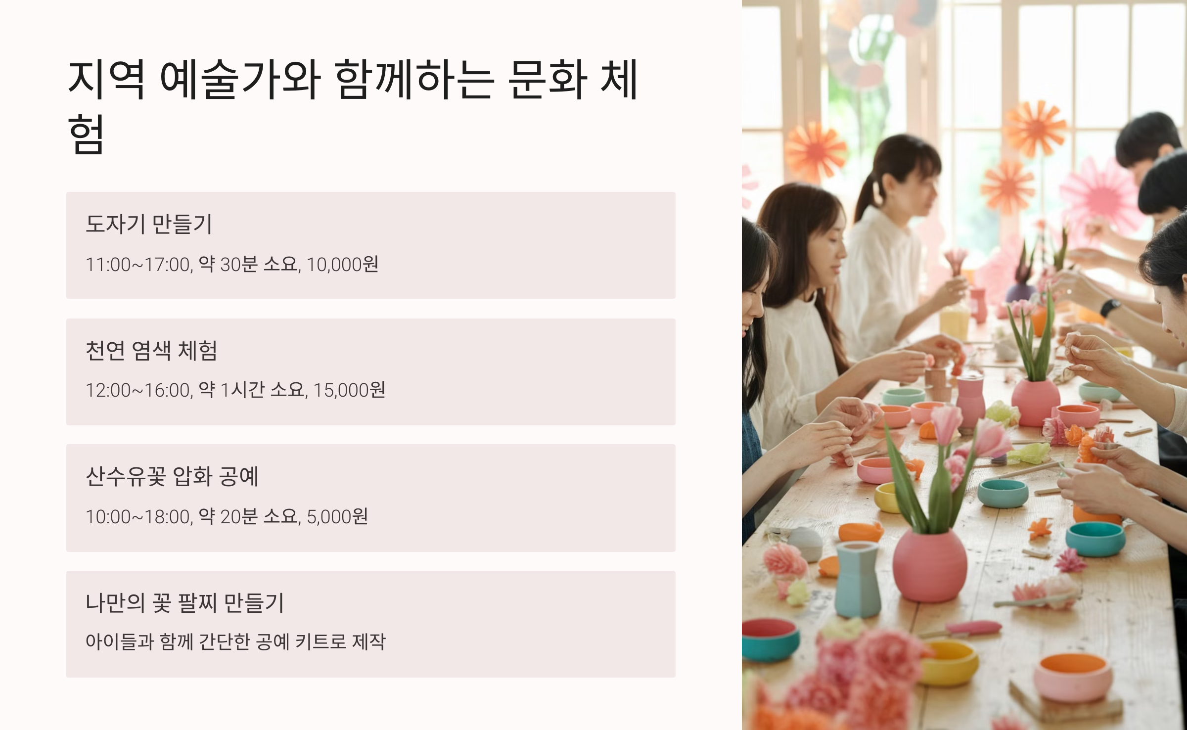 | 도자기 만들기 | 11:00 ~ 17:00 | 약 30분 | 10,000원 |