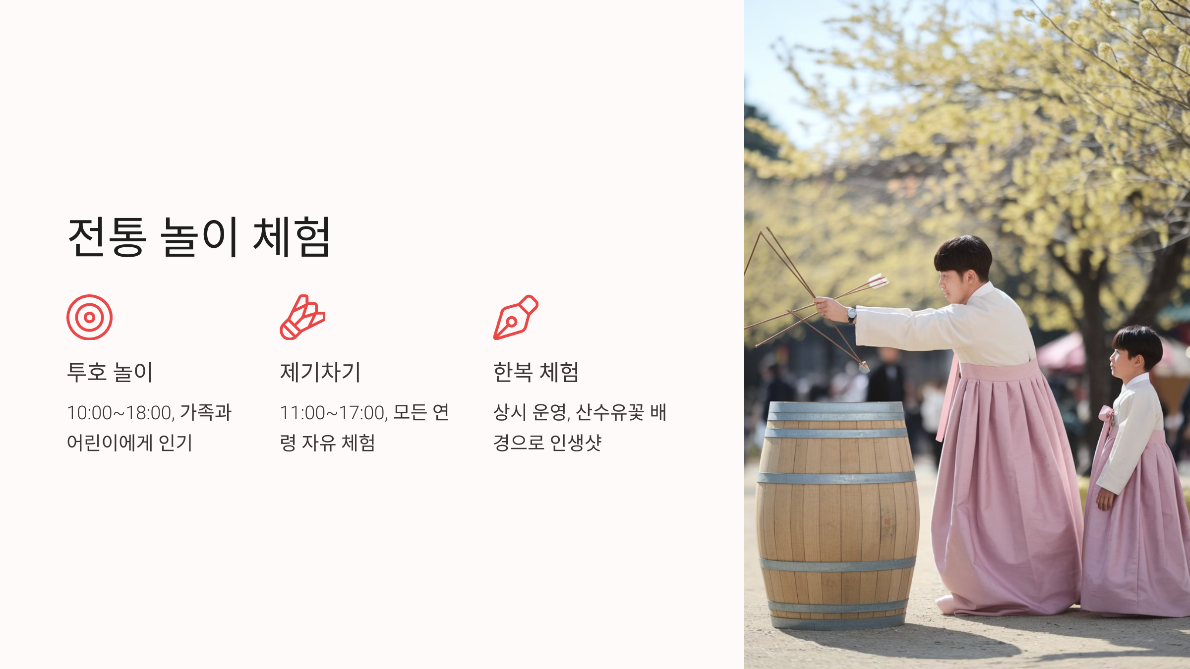 | 투호 놀이 | 10:00 ~ 18:00 | 현장 참여 가능 | 가족, 어린이 |