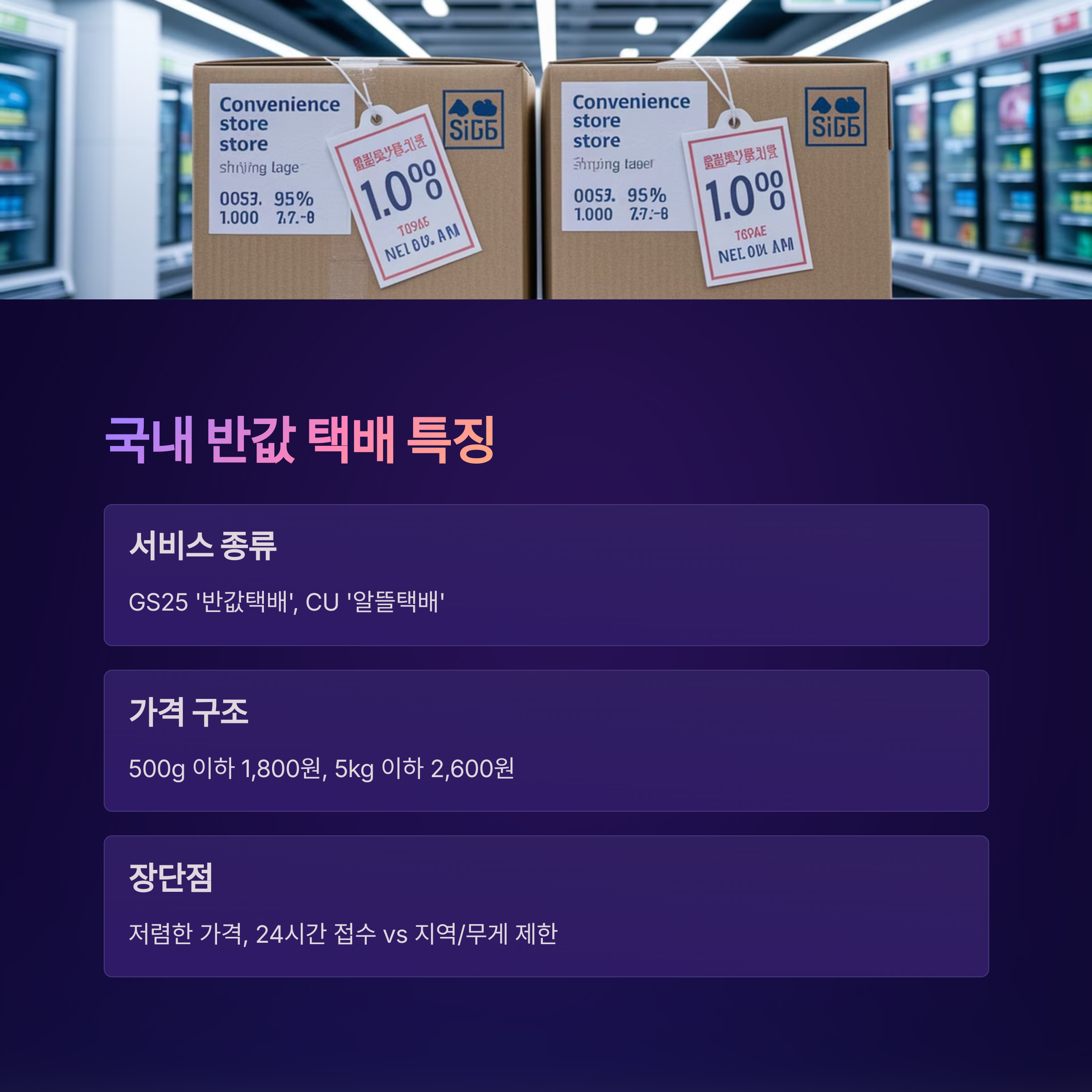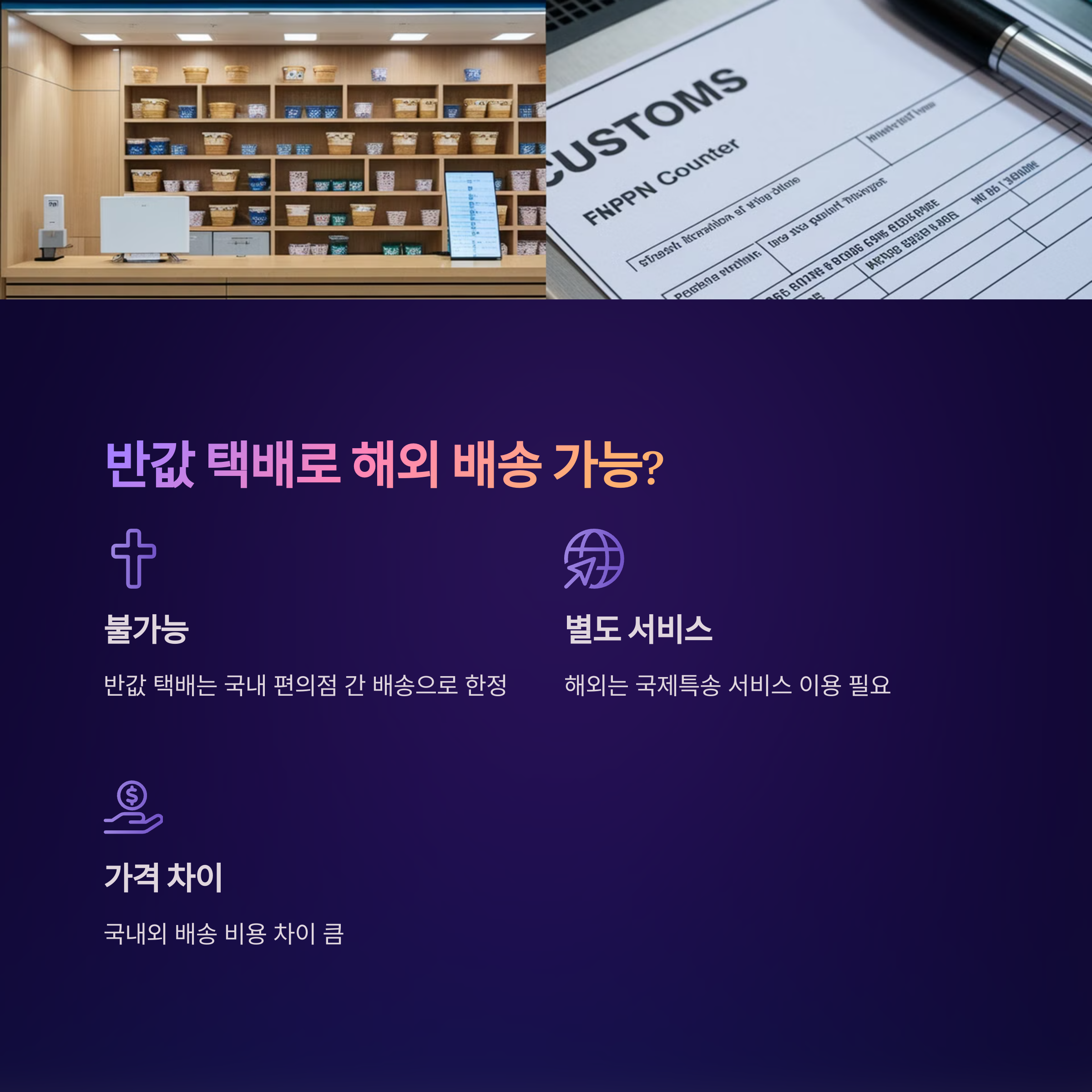 반값 택배는 CJ대한통운과 편의점이 협력해 국내 배송망을 이용하는 서비스예요. 반면 해외 배송은 항공, 선박 등 국제 물류 시스템을 활용해야 하므로, 별도의 국제 택배 서비스가 필요해요. 🌍