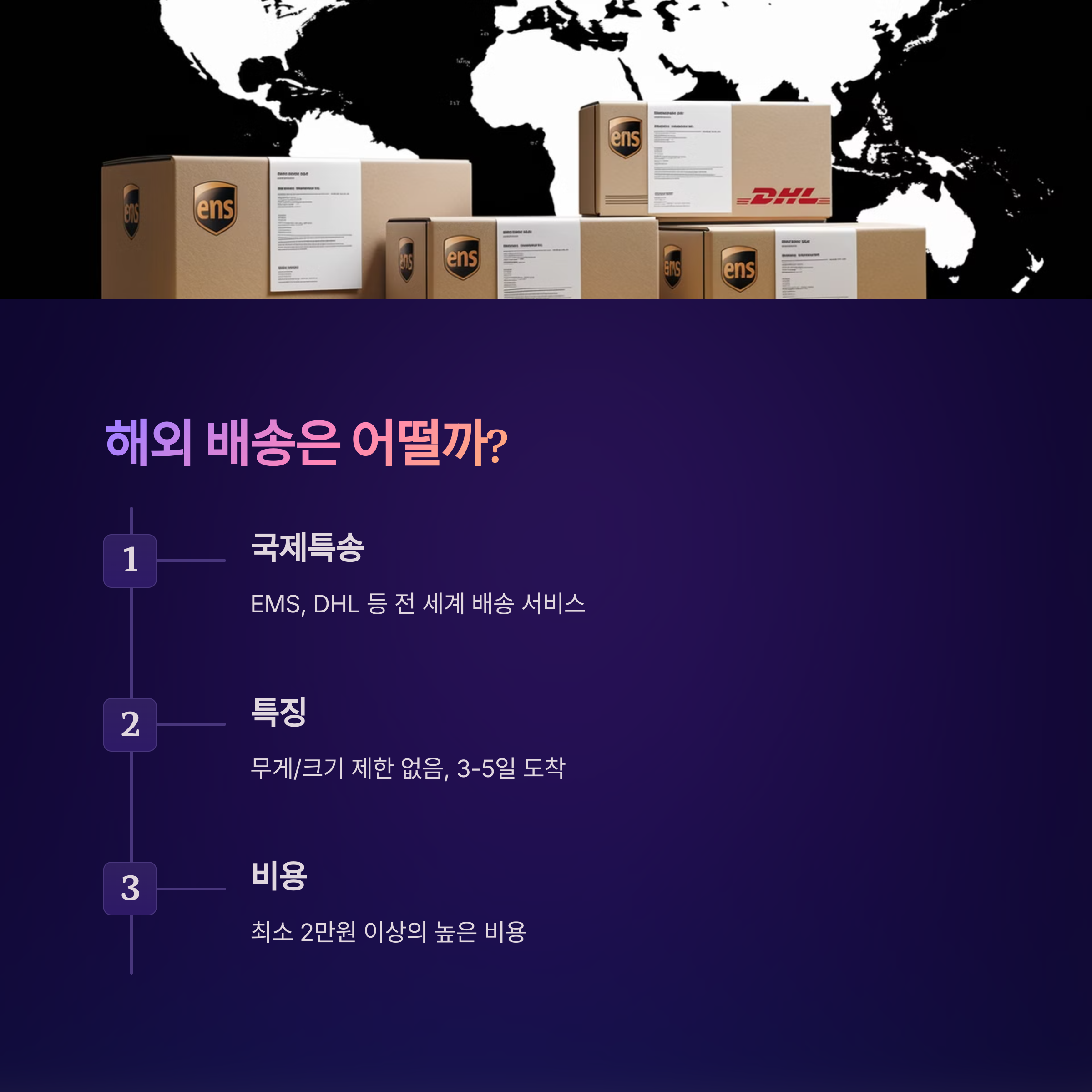 대표적인 해외 배송 서비스로는 EMS(국제우편), DHL, FedEx, UPS 등이 있어요. 일반적으로 해외 배송은 배송 속도가 빠를수록 요금이 높아지는 구조예요. 📦