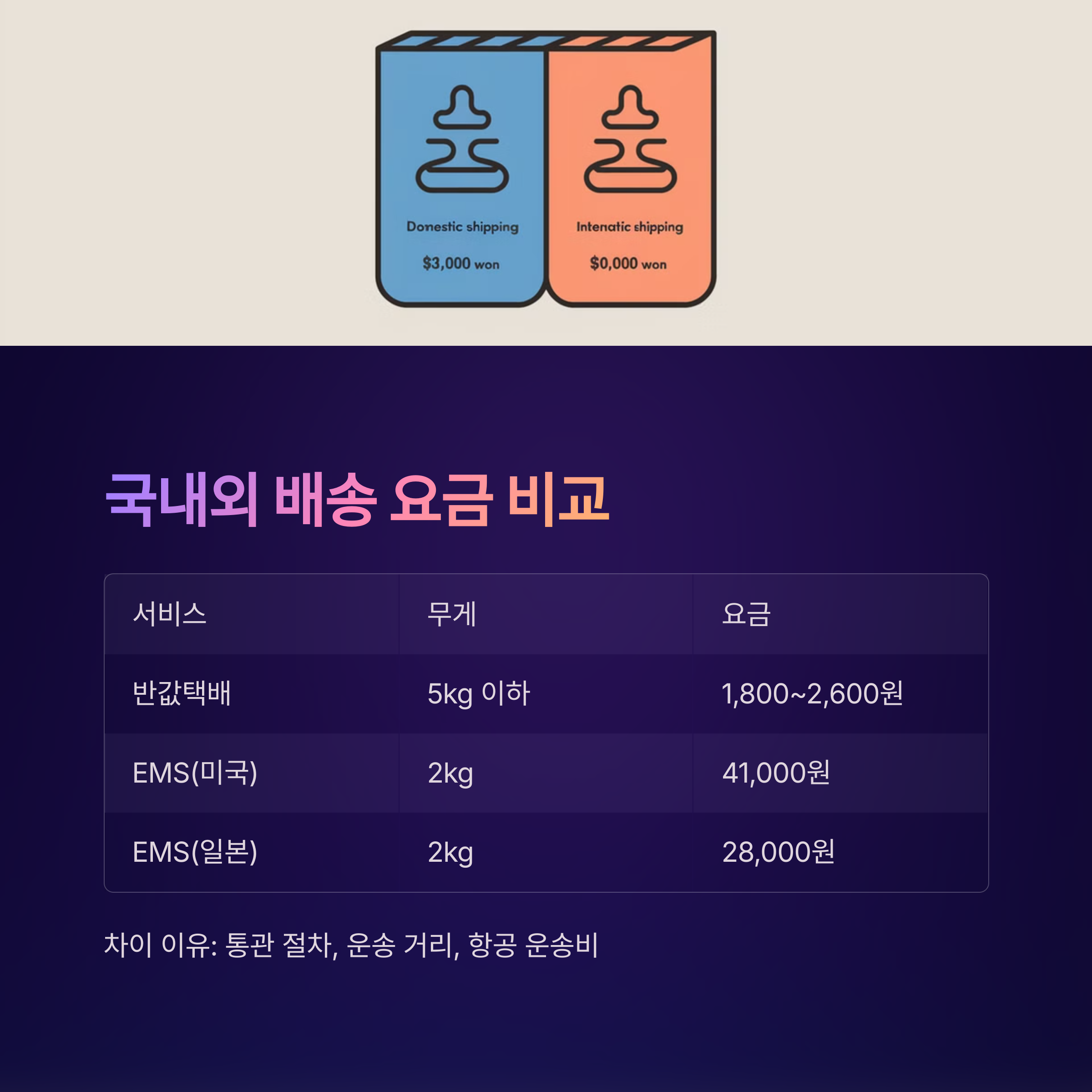 국내 택배 요금은 보통 3,000~5,000원 수준이지만, 국제 배송은 최소 10,000원 이상부터 시작해요. 📊