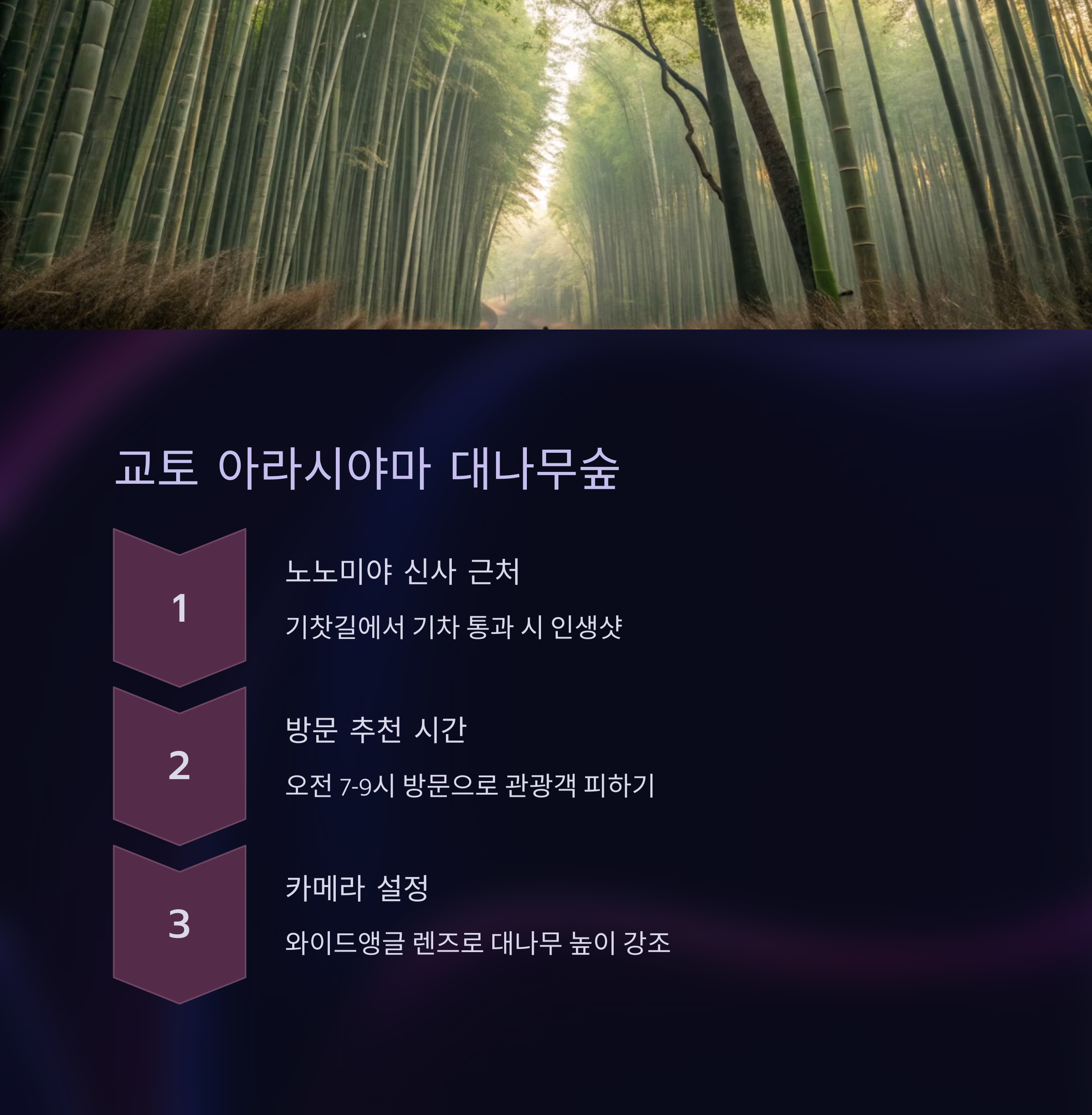 이곳에서 사진을 찍을 때는 오전 일찍 방문하는 것이 좋아요. 대나무숲은 워낙 유명한 곳이라 낮에는 관광객이 많아 한적한 분위기를 담기 어렵거든요. 아침 햇살이 비칠 때 촬영하면 부드러운 빛과 함께 더욱 멋진 사진을 남길 수 있어요.