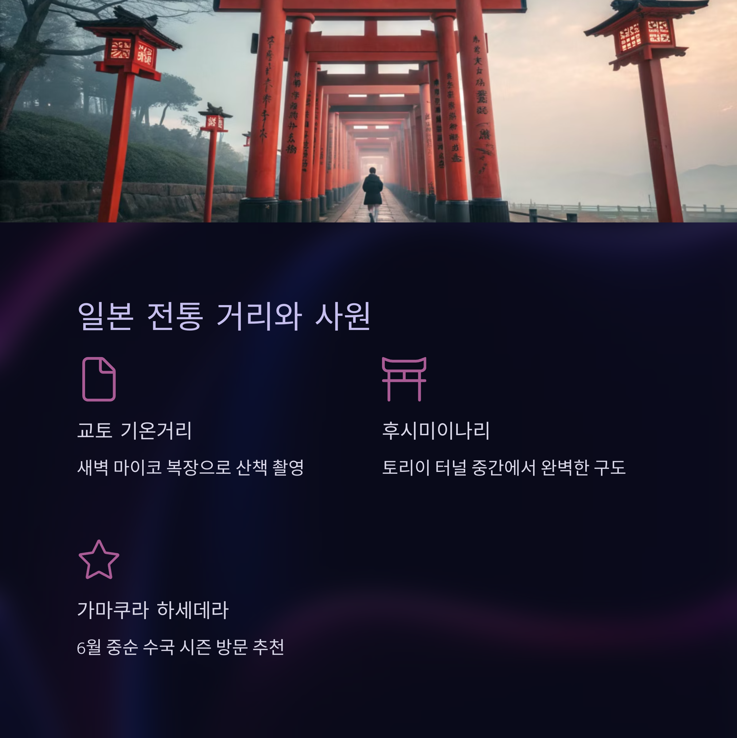 | 전통 의상 활용 | 기모노를 입고 촬영하면 일본 분위기를 더욱 살릴 수 있어요. |