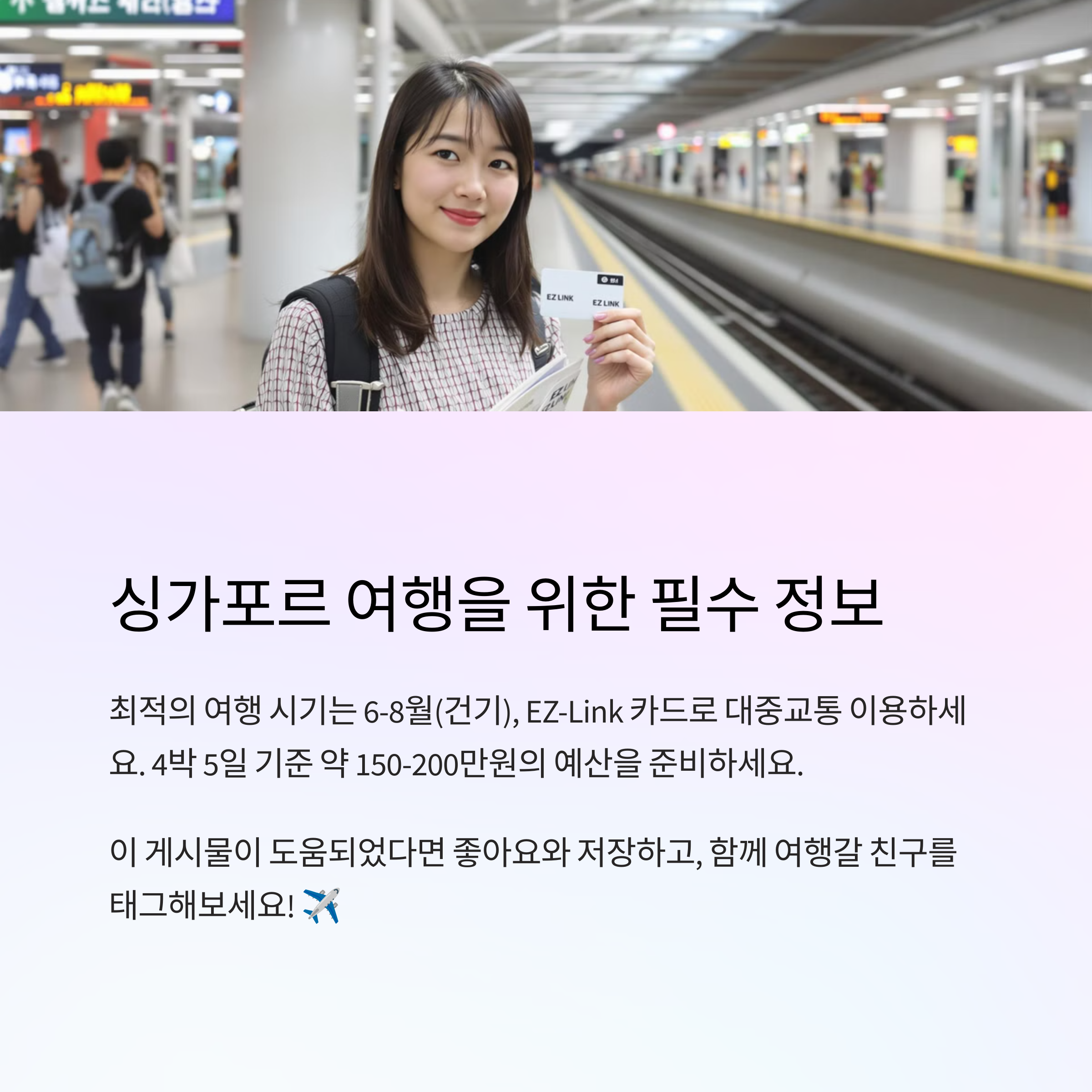 싱가포르는 현대적인 도시와 자연이 어우러진 멋진 여행지예요. 🏙️ 럭셔리한 마리나베이와 액티비티가 가득한 센토사까지, 다양한 매력을 가진 곳이죠. 이번 글에서는 싱가포르의 주요 명소와 맛집, 쇼핑 정보까지 완벽하게 알려드릴게요! ✨🛍️
