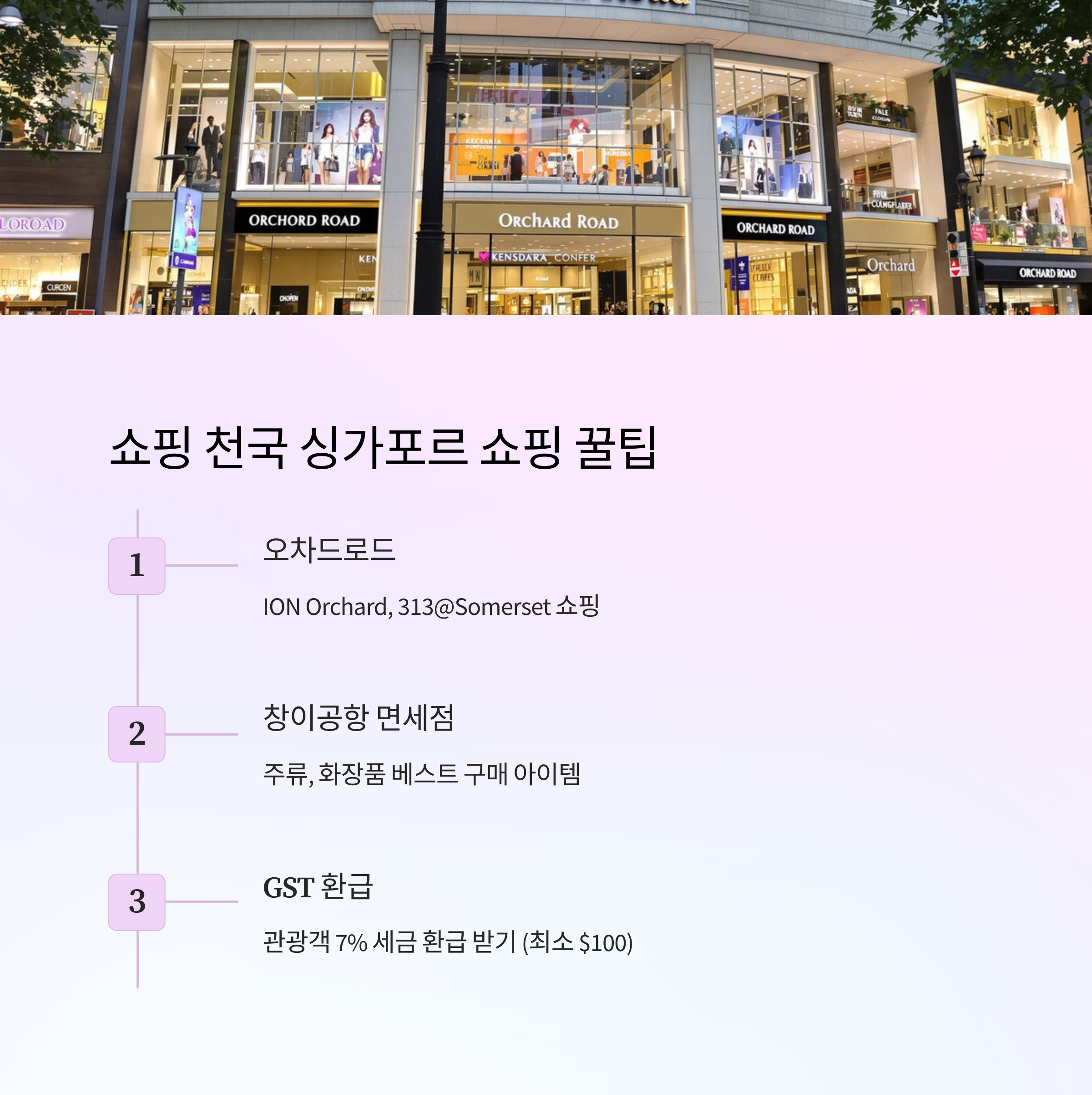싱가포르는 다양한 쇼핑 명소와 면세 쇼핑의 천국이에요. 특히 오차드 로드(Orchard Road)는 고급 브랜드부터 대중적인 쇼핑몰까지 모두 모여 있어요. 🛒🛍️