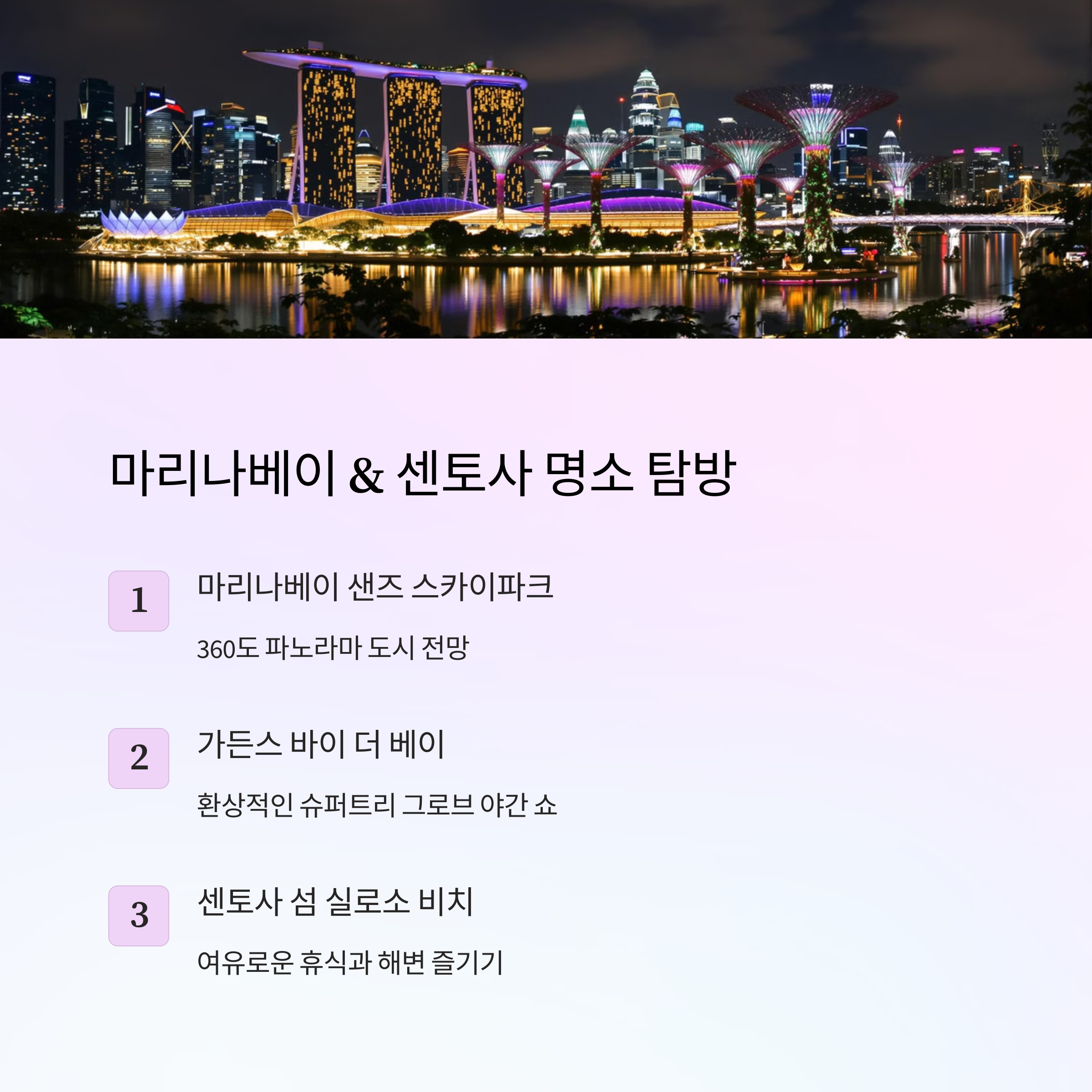 싱가포르 여행에서 가장 먼저 떠오르는 곳은 바로 마리나베이(Marina Bay)와 센토사(Sentosa)예요. 마리나베이 샌즈 호텔(Marina Bay Sands)은 세계적인 랜드마크로, 인피니티 풀에서 바라보는 도심 야경은 환상적이죠. 🏙️🏊♂️