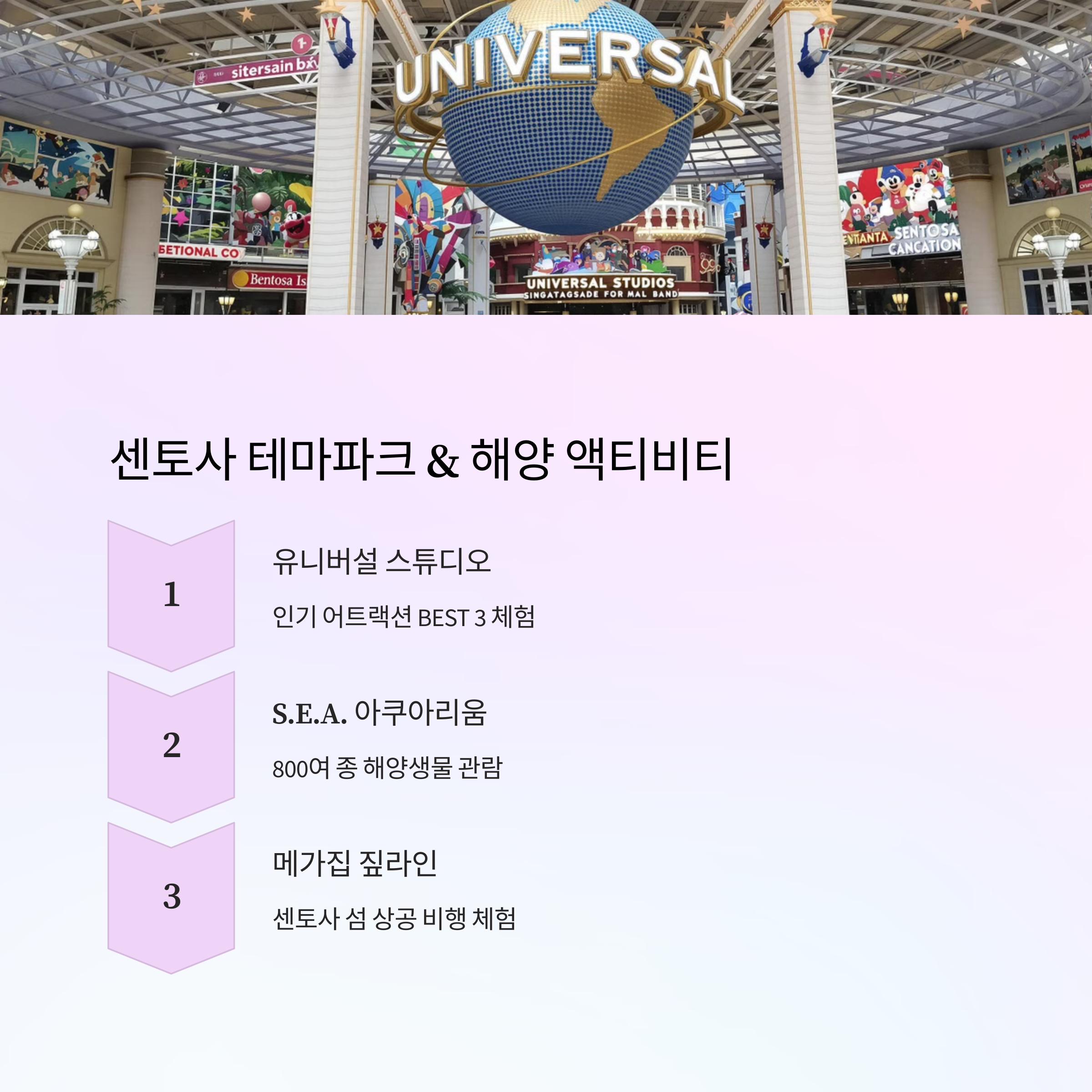 | 유니버설 스튜디오 | 센토사 | 테마파크, 다양한 놀이기구 |
