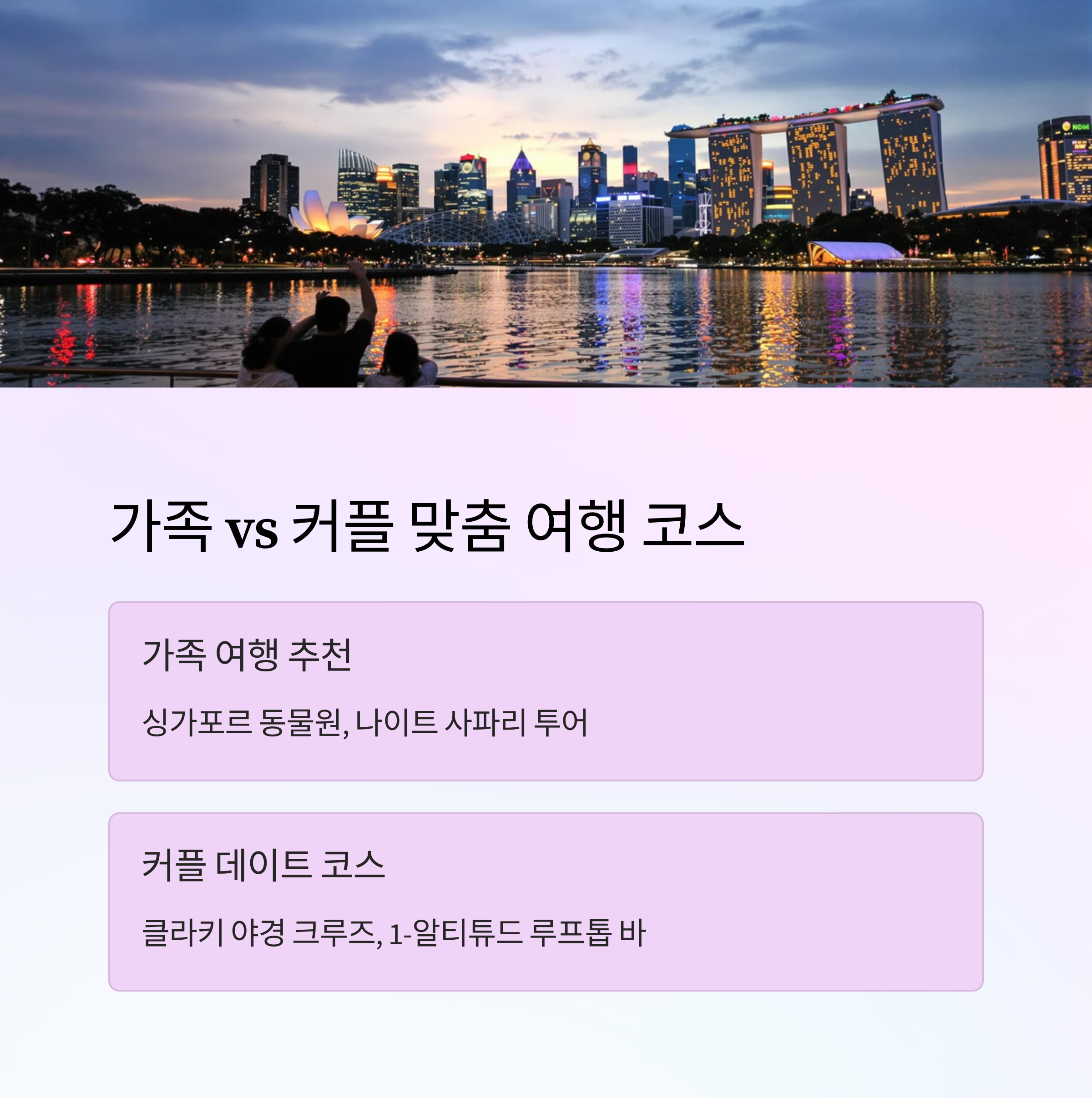싱가포르는 가족 단위 여행자와 커플 모두에게 최적화된 여행지예요. 다양한 테마파크와 자연 체험을 즐길 수 있는 가족 여행과, 로맨틱한 야경과 고급스러운 디너를 즐길 수 있는 커플 여행을 비교해 볼게요. 😊💕