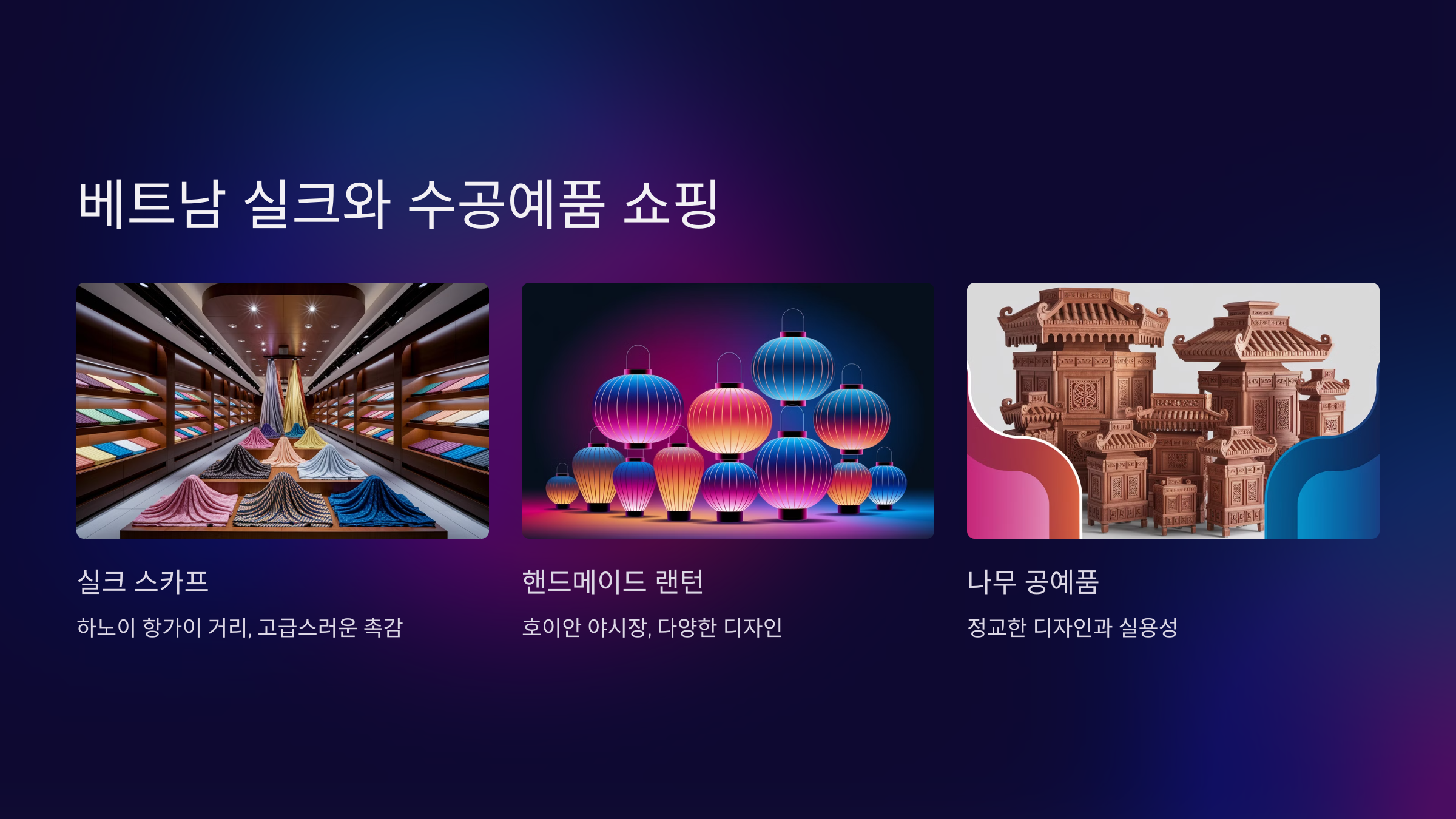 베트남 실크와 수공예품은 품질도 좋고, 가격 대비 만족도가 높아요. 특히 선물용으로도 제격이니 가족과 친구들에게 좋은 기념이 될 거예요! 🎁😊