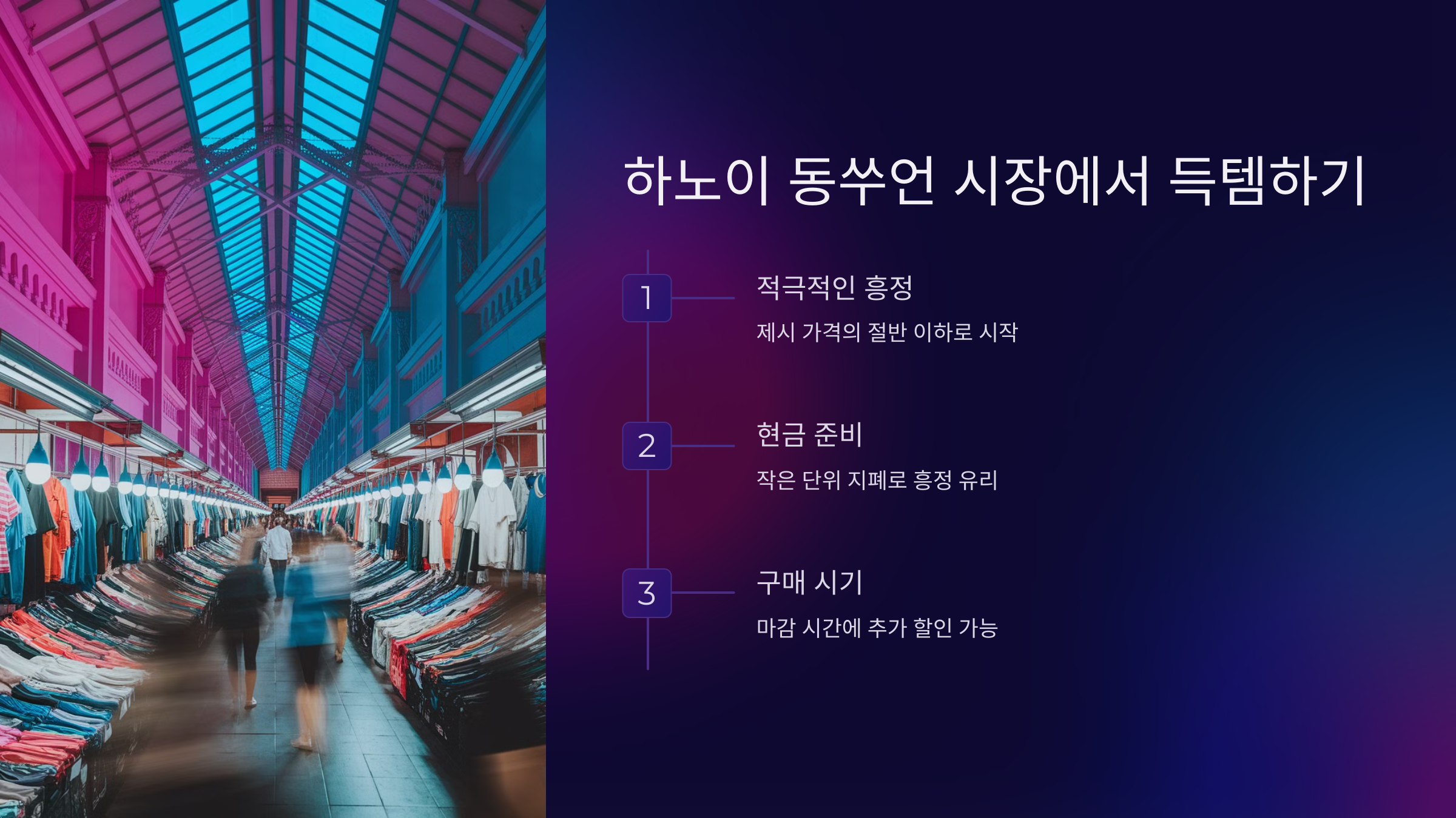 야시장에서는 흥정이 필수예요. 처음 제시된 가격에서 50% 이상 낮춰 부르며 협상해보세요. 특히 현금 결제를 선호하니, 베트남 동(VND)을 준비하는 것이 좋아요. 작은 지폐로 준비하면 흥정 시 유리해요!