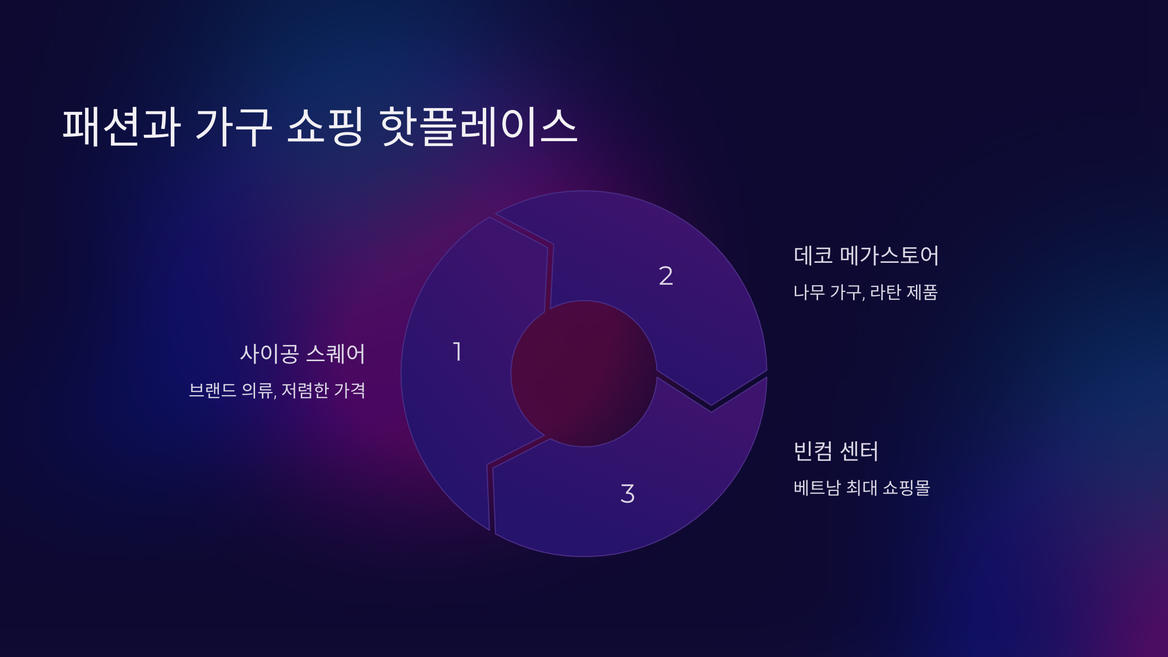 베트남은 다양한 전통시장과 현대적인 쇼핑몰이 어우러진 쇼핑 천국이에요. 호치민의 벤탄 시장, 하노이의 동쑤언 시장, 그리고 다낭의 한(Han) 시장까지 가볼 만한 곳이 정말 많아요. 특히 합리적인 가격에 기념품과 패션 아이템을 득템할 수 있어요! 😊