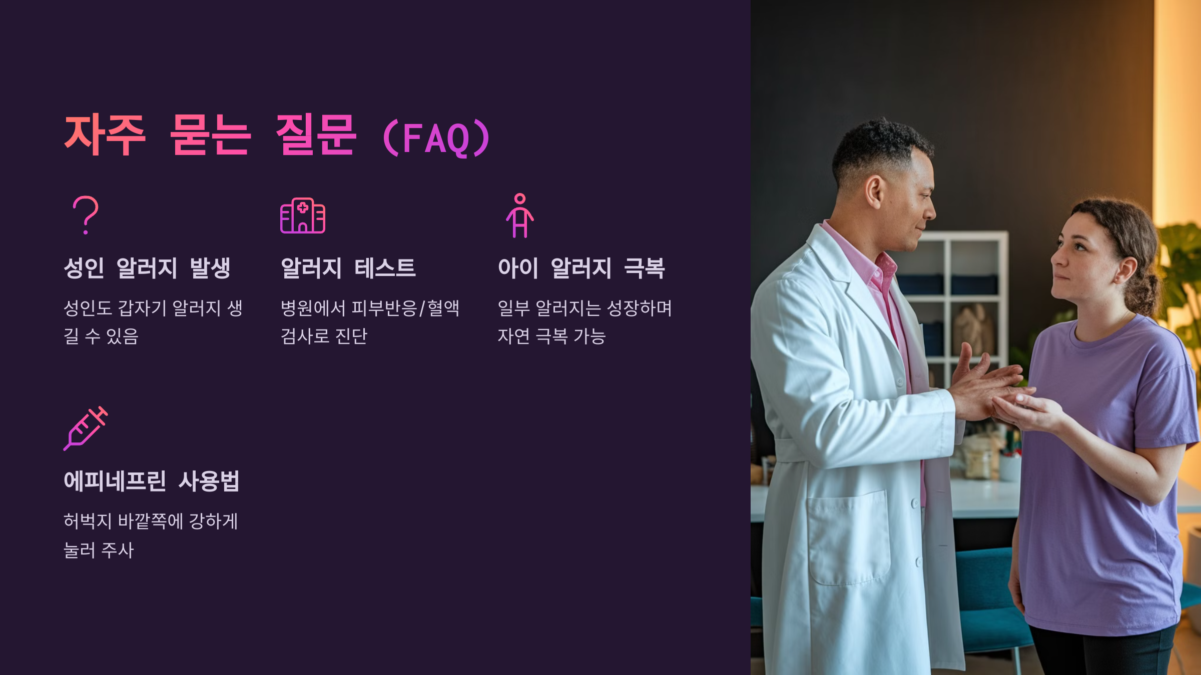 응급 상황에서는 주변 사람들에게 알러지 상태를 알리고, 의료진에게 알러지 종류와 복용 중인 약물을 정확히 전달하는 것이 중요해요. 알러지 팔찌나 카드 등을 항상 소지하면 도움이 될 수 있어요.
