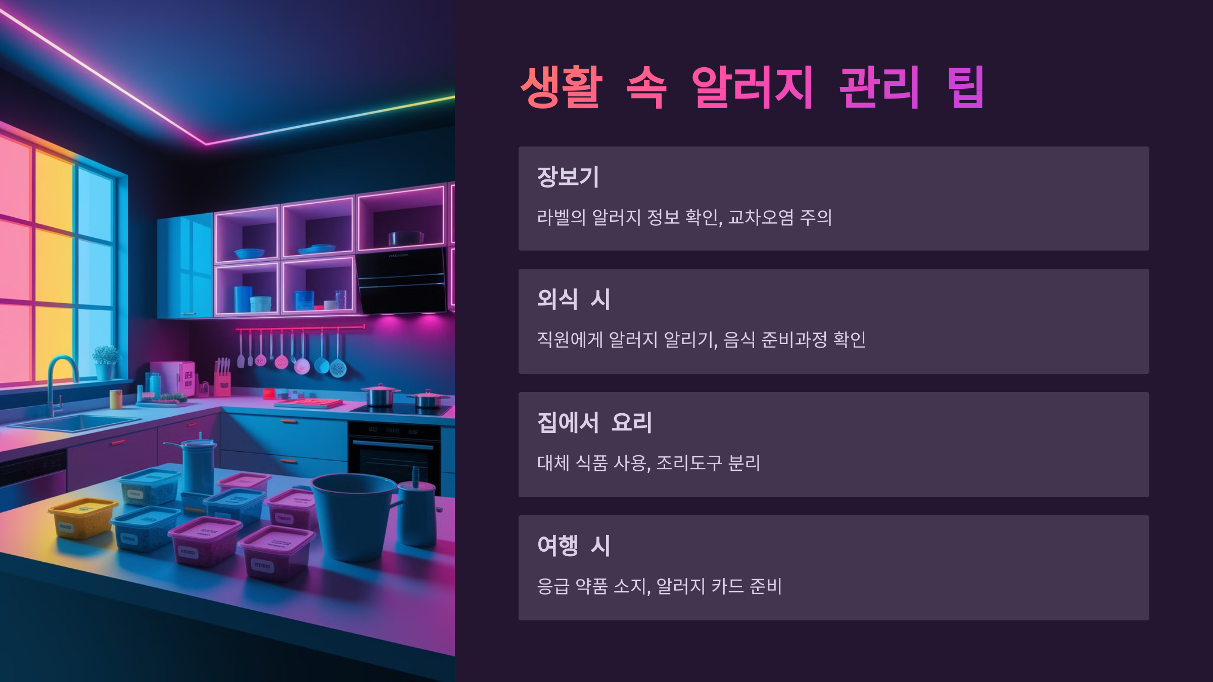 음식 알러지를 안전하게 관리하려면 식단을 철저하게 관리해야 해요. 집에서 요리할 때는 사용되는 모든 재료의 성분을 확인하고, 가공식품의 라벨을 꼼꼼히 읽는 것이 중요해요. 특히 "알러지 유발 가능성 있음" 표시가 있는 제품은 피하는 것이 좋아요.