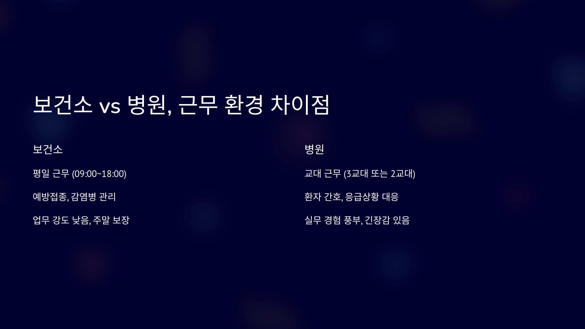 이처럼 보건소는 규칙적인 근무와 지역사회 보건을 중점으로 하고, 병원은 실무 경험과 응급 상황 대처 능력을 키울 수 있어요. 본인의 커리어 방향에 맞는 근무지를 선택하는 것이 중요해요. 😊