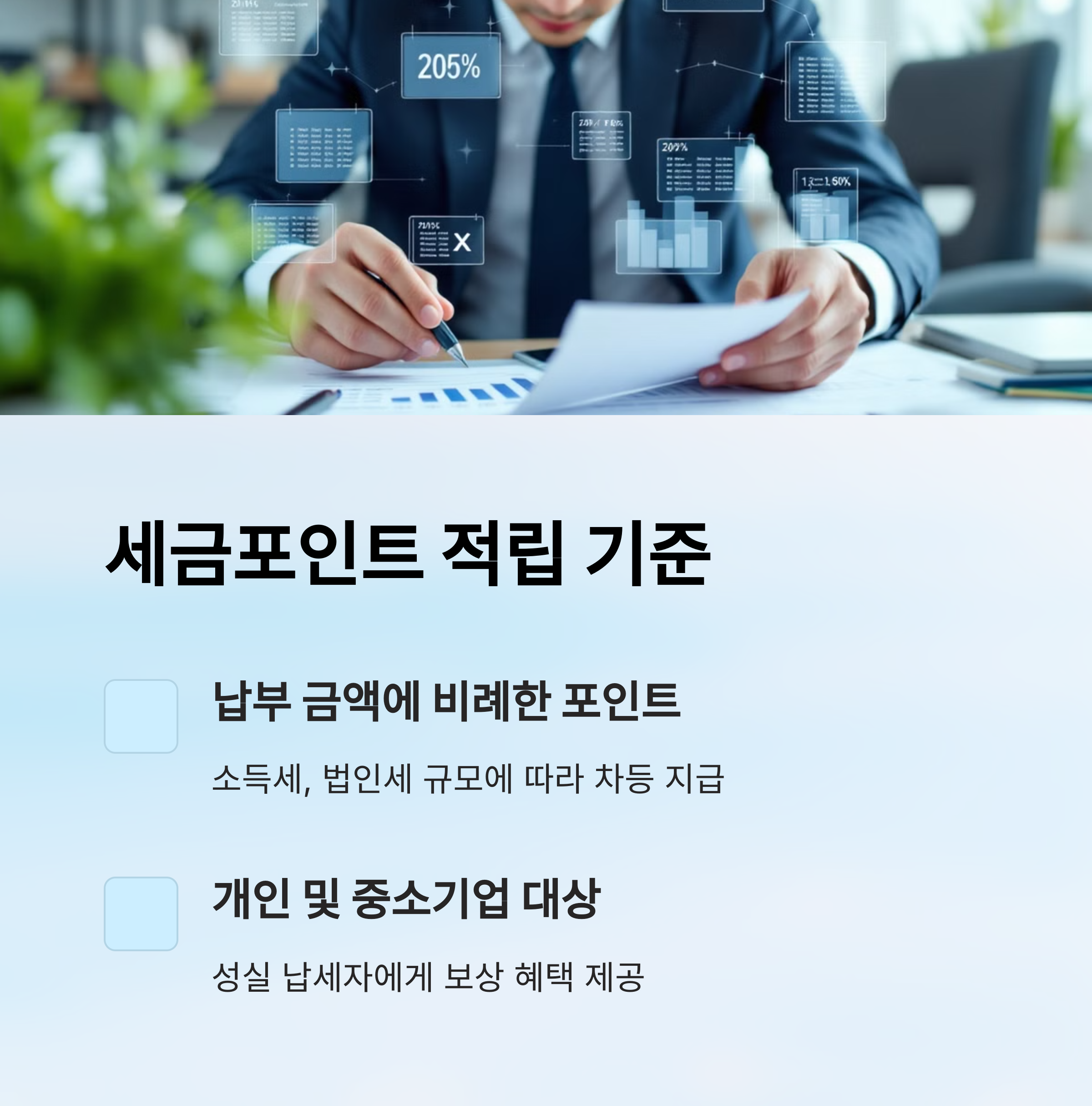 💰 적립 기준 – 부가가치세, 종합소득세, 법인세 등 납부 세액 기준 – 납부 금액 10만 원당 1점 적립 (2024년 기준) – 최대 적립 한도 없음, 매년 누적 가능
