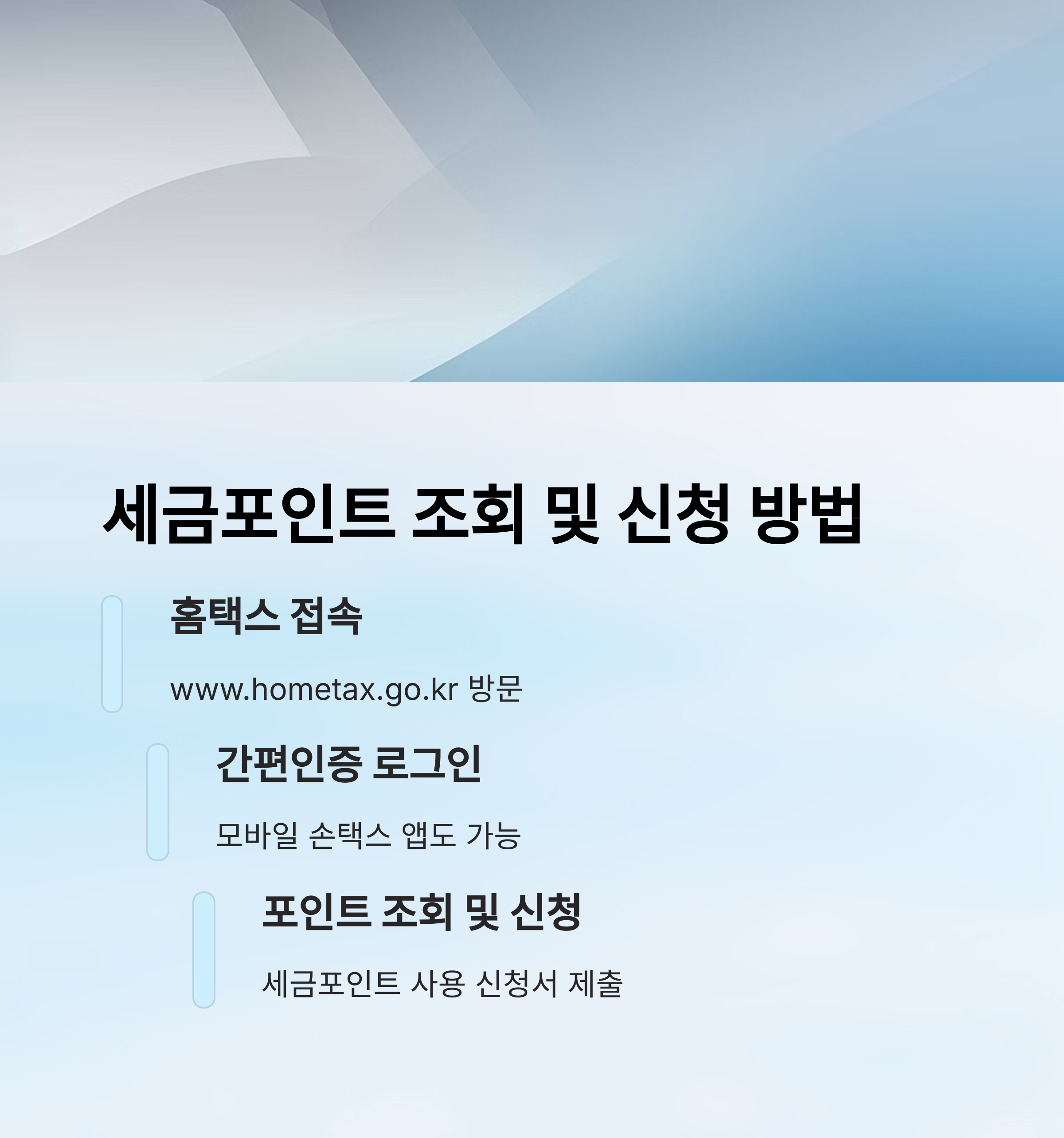 📲 PC 홈택스 ① 홈택스 접속 → 로그인 ② [조회/발급] → [세금포인트 조회 및 사용] ③ 누적 포인트 확인 + 사용 신청 버튼 클릭 📱 손택스(모바일) ① 앱 실행 후 로그인 ② [My 홈택스] → [세금포인트 조회] ③ 포인트 내역 확인 + 민원용 증명서 발급 📌 공동인증서 필요 – 개인/법인 구분 없이 본인 인증 필수 – 간편인증은 아직 미지원