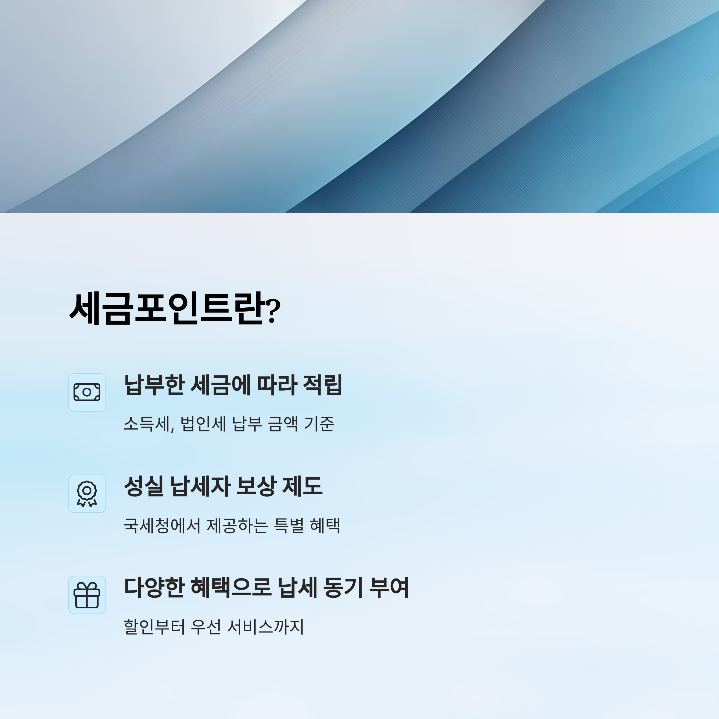 국세청의 세금포인트 제도는 성실납세자에게 혜택을 주기 위해 2005년부터 도입된 제도예요. 납부한 세액에 따라 포인트가 쌓이고, 일정 조건을 만족하면 다양한 세무서비스를 혜택으로 받을 수 있어요 📊